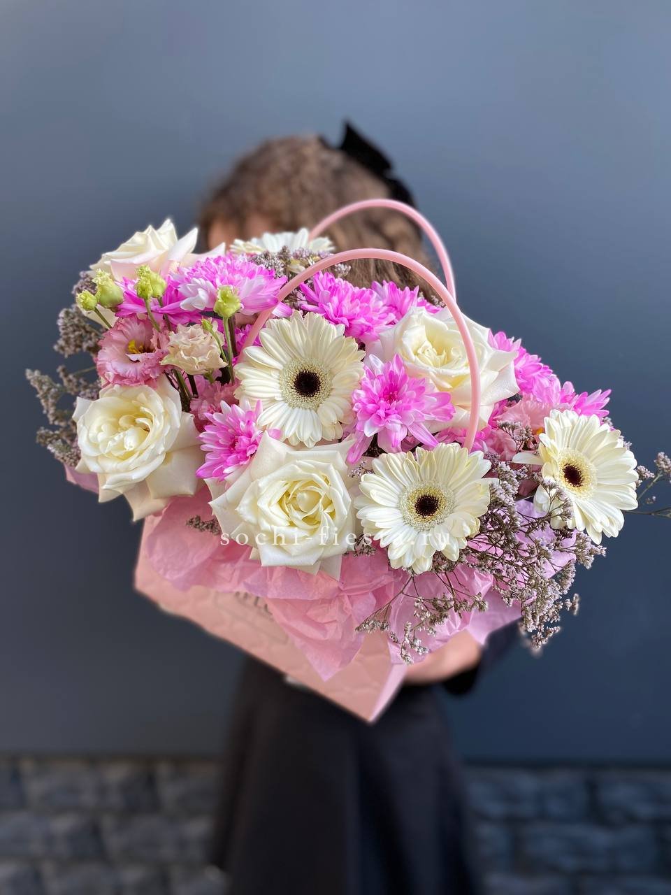 Герберы задают ритм композиции яркими пятнами среди белых роз и кустовой хризантемы. Лимониум заполняет объём воздушной текстурой. Сумка-кашпо удерживает форму и позволяет поставить букет без дополнительной вазы.