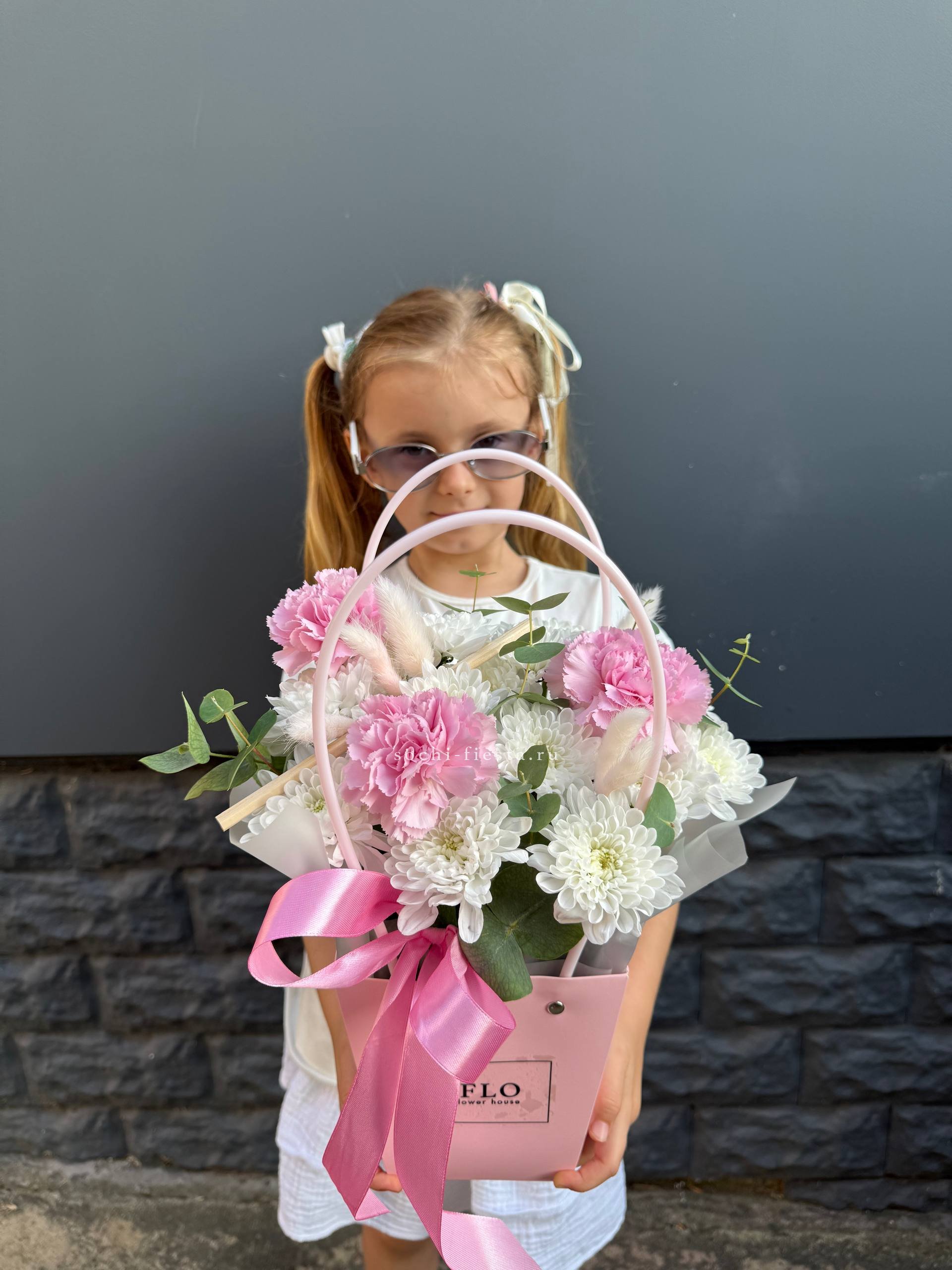 Компактная сумочка в двух оттенках объединяет цветы с мягкими переходами тонов. Форма держится плотно и естественно.