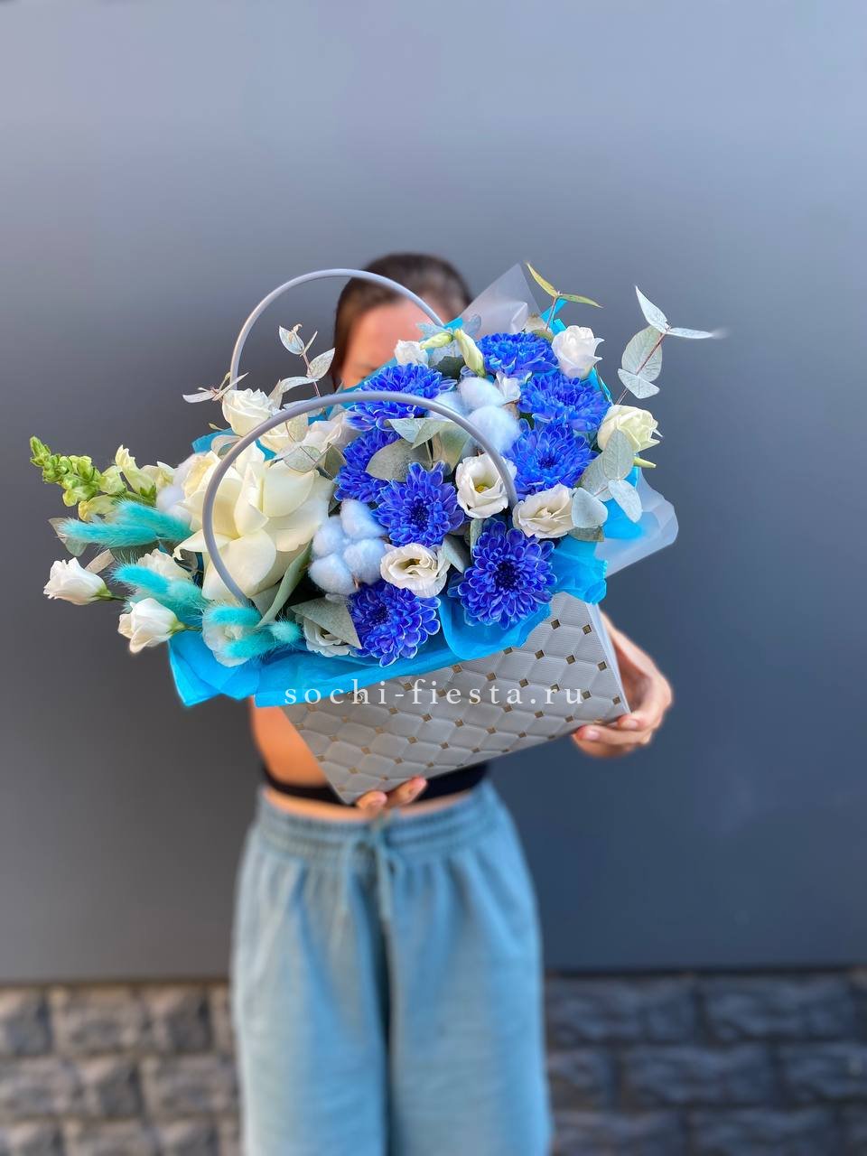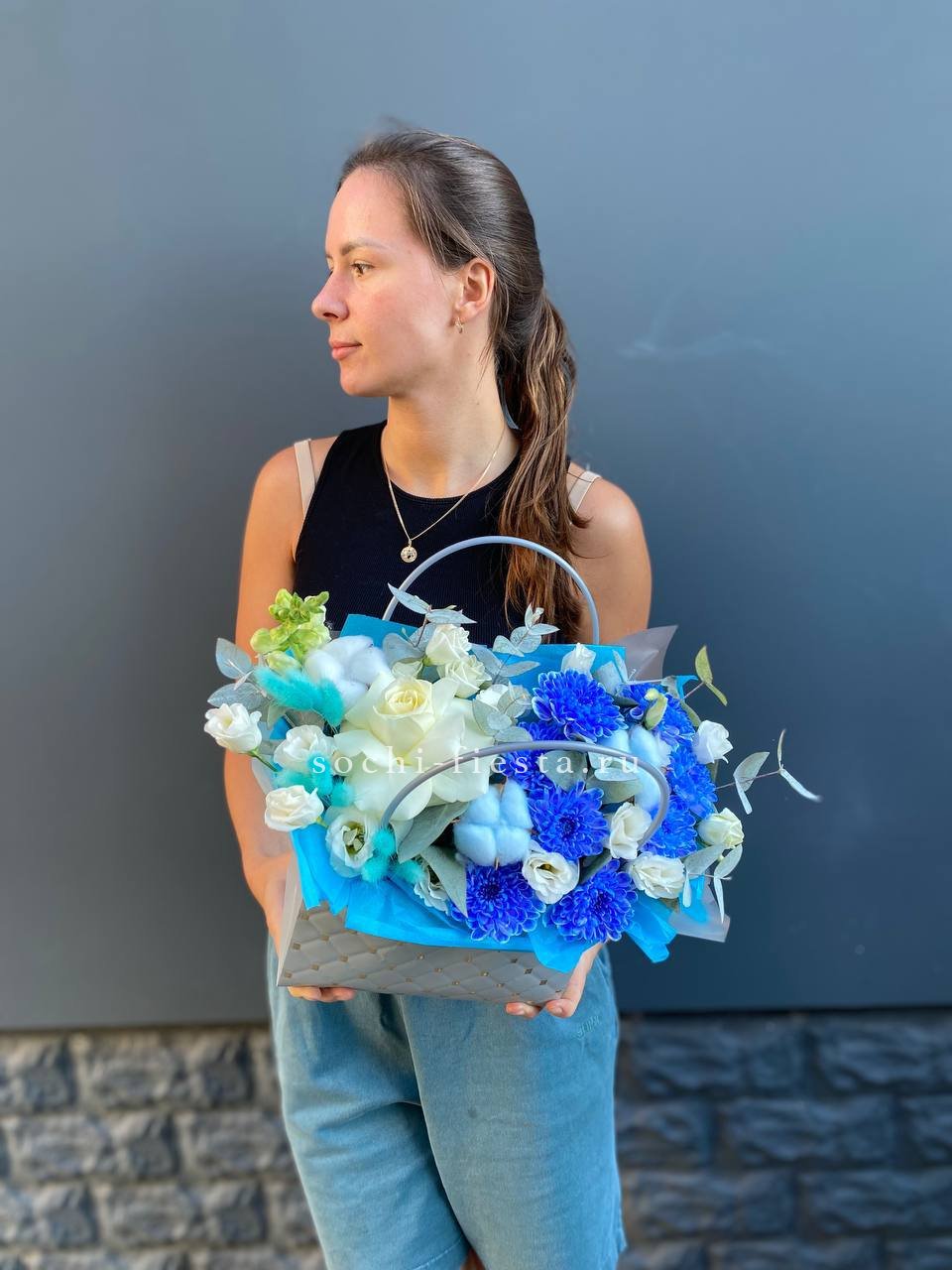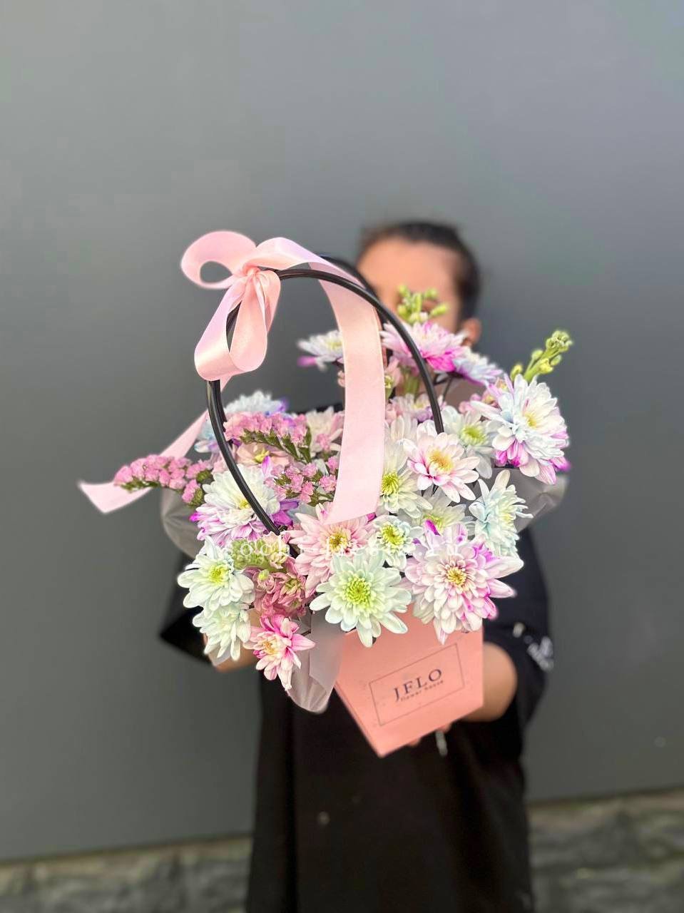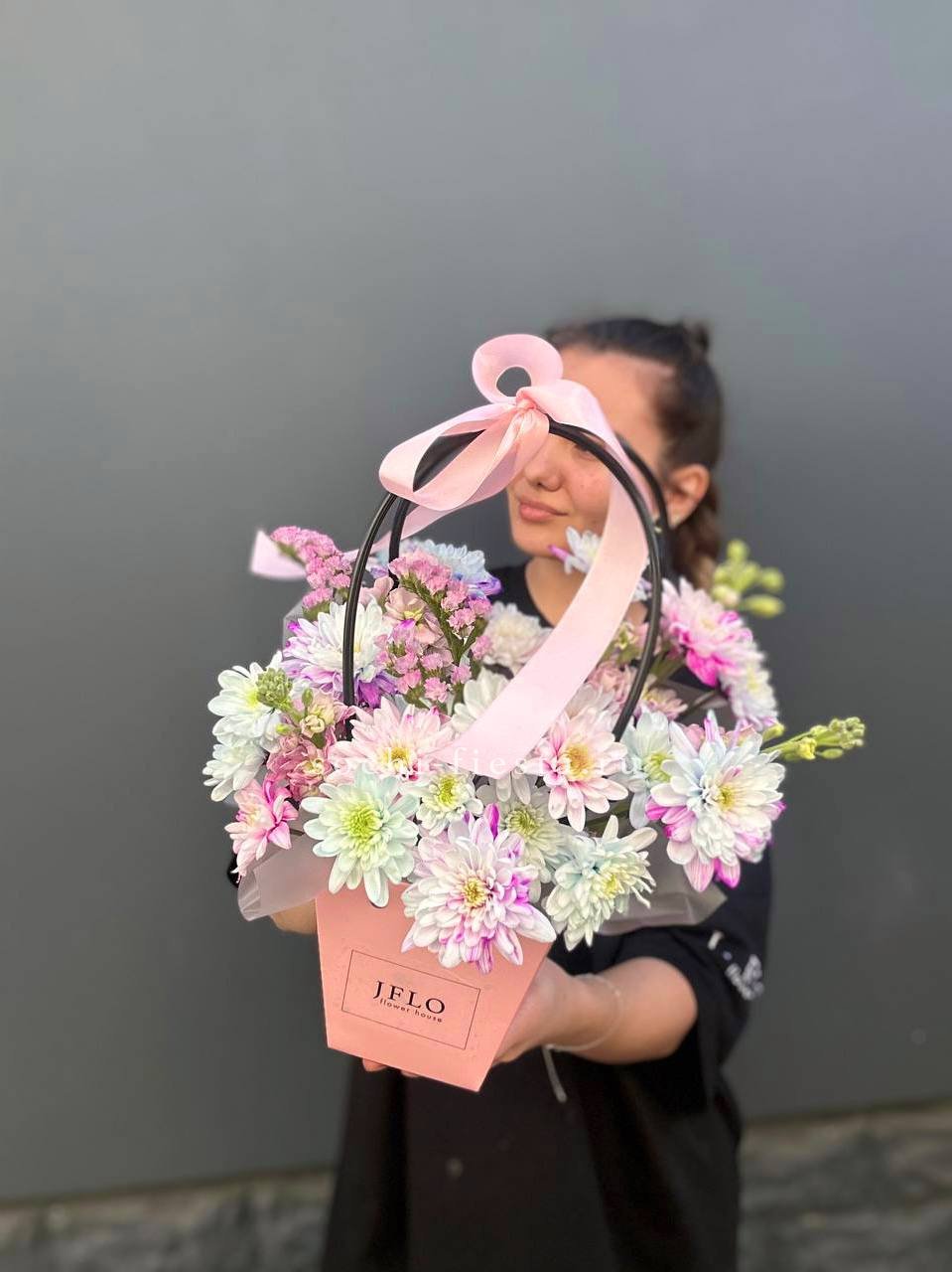 Хризантемы с пушистыми коробочками хлопка создают теплую домашнюю композицию в удобной сумочке. Цветы долго радуют взгляд и не требуют сложного ухода. Формат подходит для размещения в любом уголке дома.