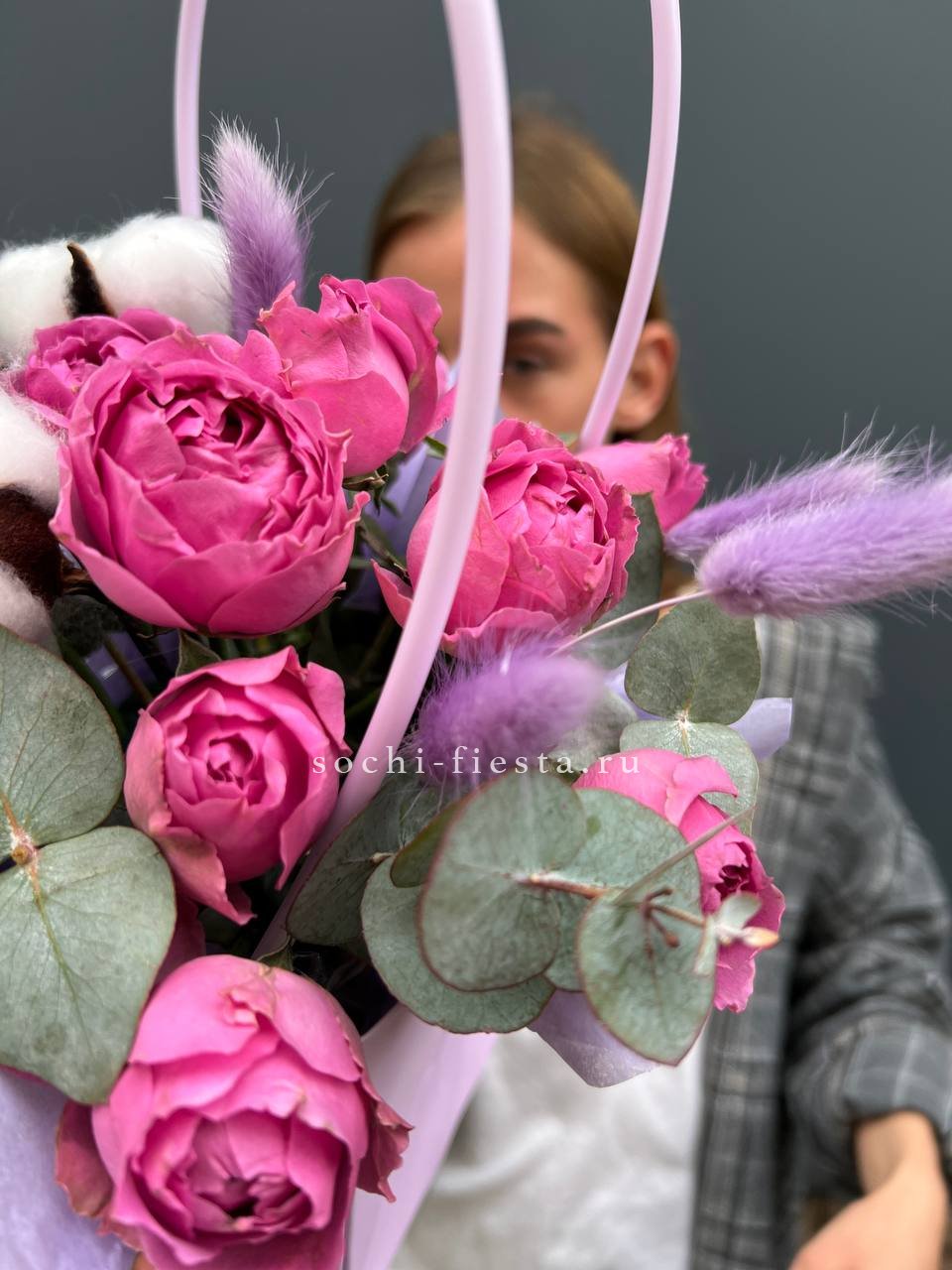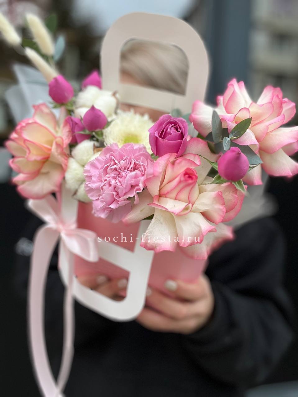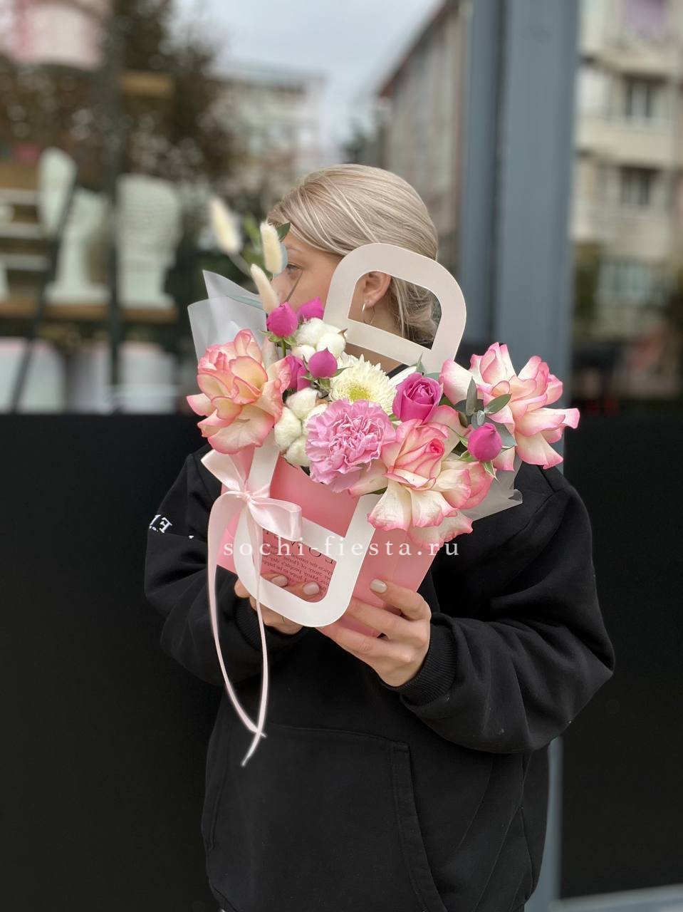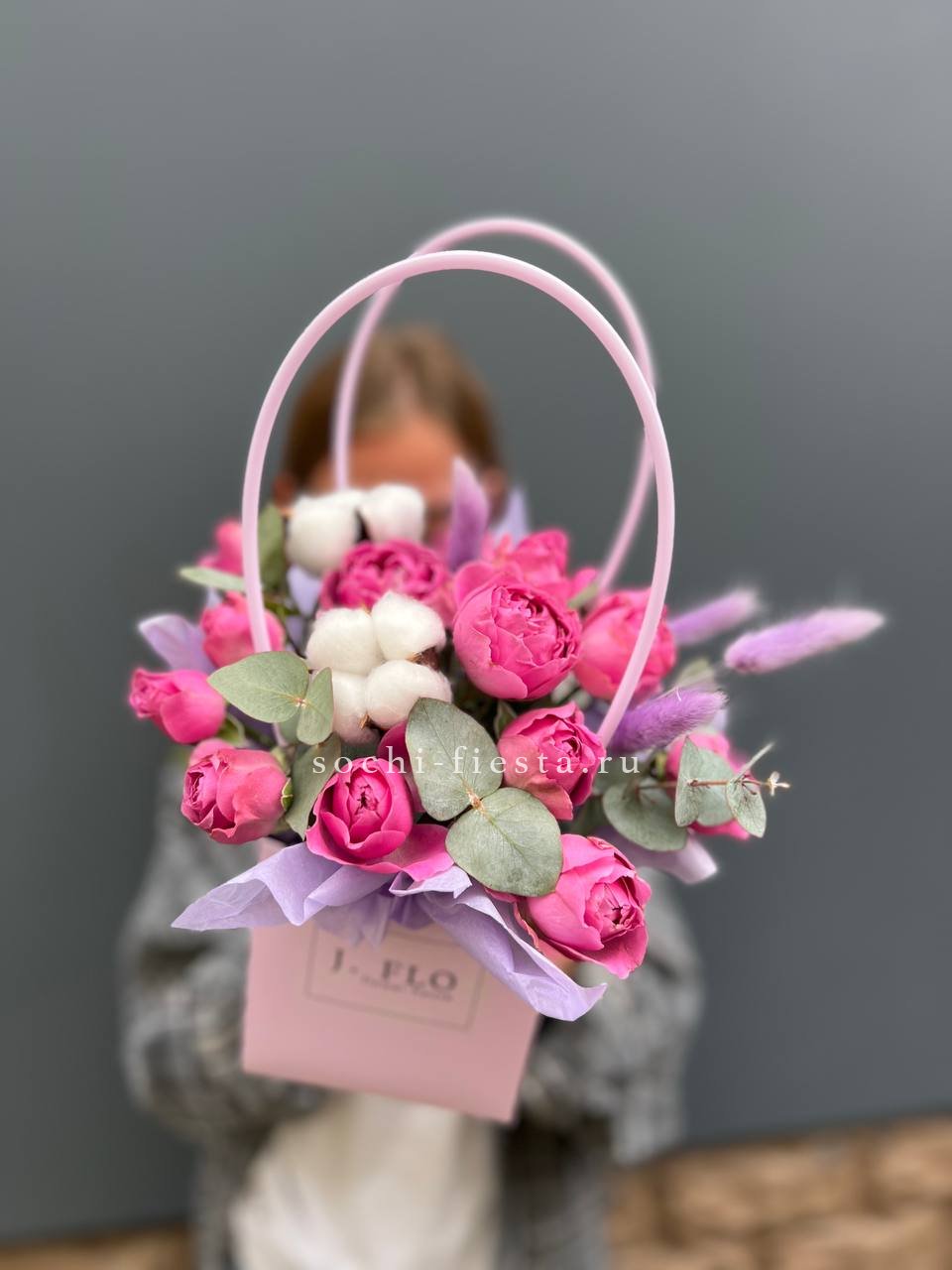 Хризантемы с пушистыми коробочками хлопка создают теплую домашнюю композицию в удобной сумочке. Цветы долго радуют взгляд и не требуют сложного ухода. Формат подходит для размещения в любом уголке дома.