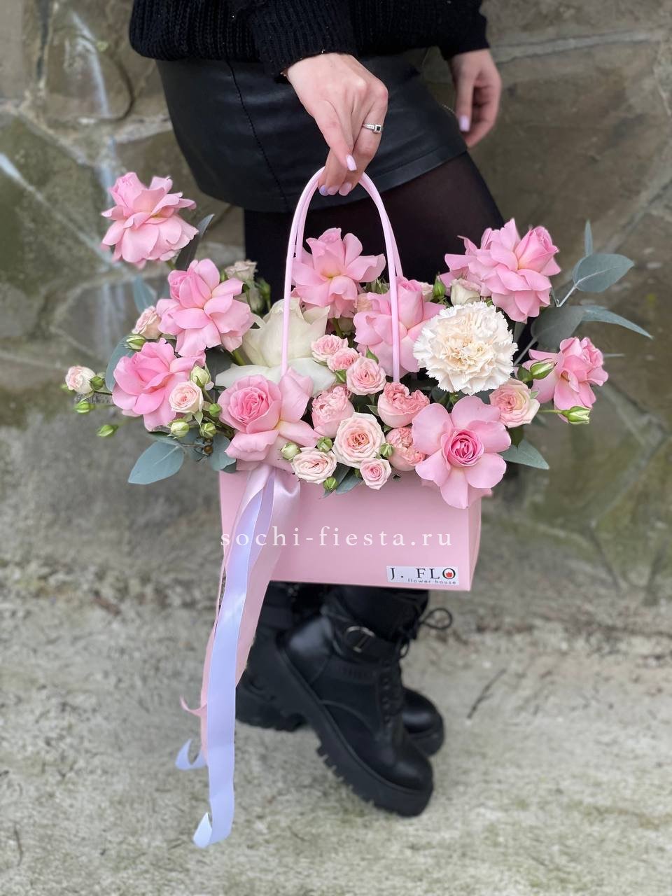 гортензия, диантус, розовая роза, эустома, гербера, корзина средняя, наполнение.
