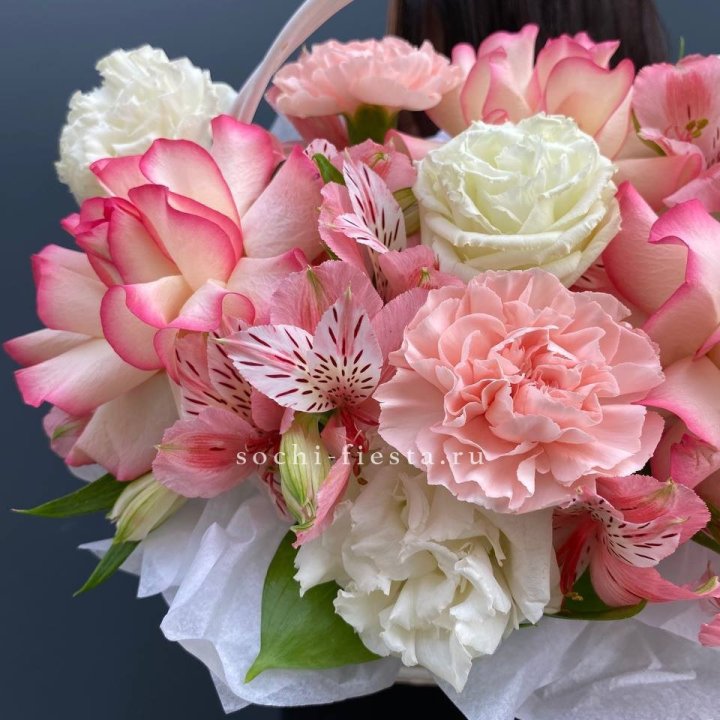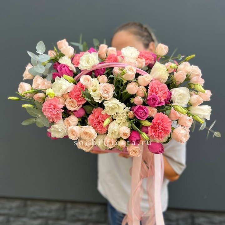 Состав корзин в Бийске определяется текущими поставками и сезоном. Розы Freedom, Mondial, Cappuccino — для классических куполообразных аранжировок. Пионы в мае-июне из свежих поставок: Sarah Bernhardt, Red Charm, Bowl of Cream — главный сезонный продукт. Хризантема, альстромерия, гербера — для объёмных торжественных наполнений. Эустома, ранункули — для садовых корзин. Флорист строит состав под конкретный запрос.
