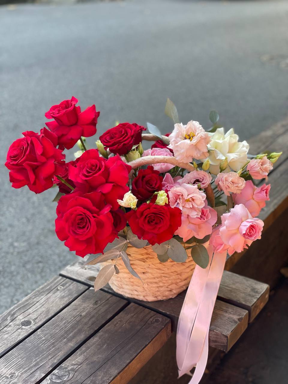 Пятьсот пять алых бутонов собраны в масштабную корзину, которая заполняет пространство цветом и объемом. Это композиция, которая говорит сама за себя своим количеством и насыщенностью.