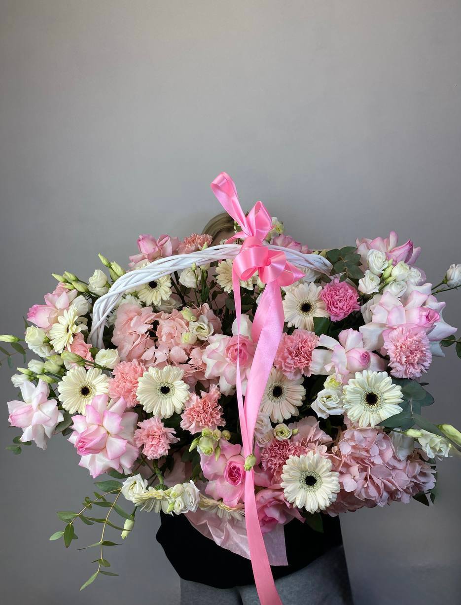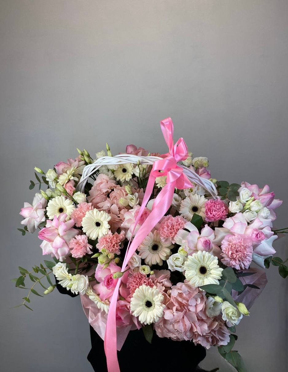 Пышная корзина с крупными бутонами роз, лилий и гортензий создаёт объёмную композицию с плавными переходами между соцветиями. Пионы добавляют воздушности и мягкости всей форме.