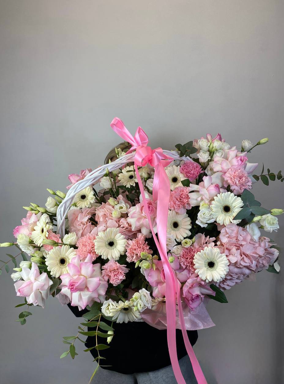 Гортензия и эустома задают объём, а яркие герберы расставляют цветовые акценты по всей композиции. Диантус и хайди добавляют воздушности, эвкалипт завершает силуэт мягкими линиями. Корзина держит форму и создаёт устойчивую основу для пышной композиции.