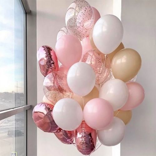 Пятнадцать воздушных сфер в пудровой гамме собраны в лёгкое парящее облако. Золото добавляет тепла, а розовый и беж создают мягкий переход оттенков. Композиция удерживается грузиком и смотрится невесомо.
