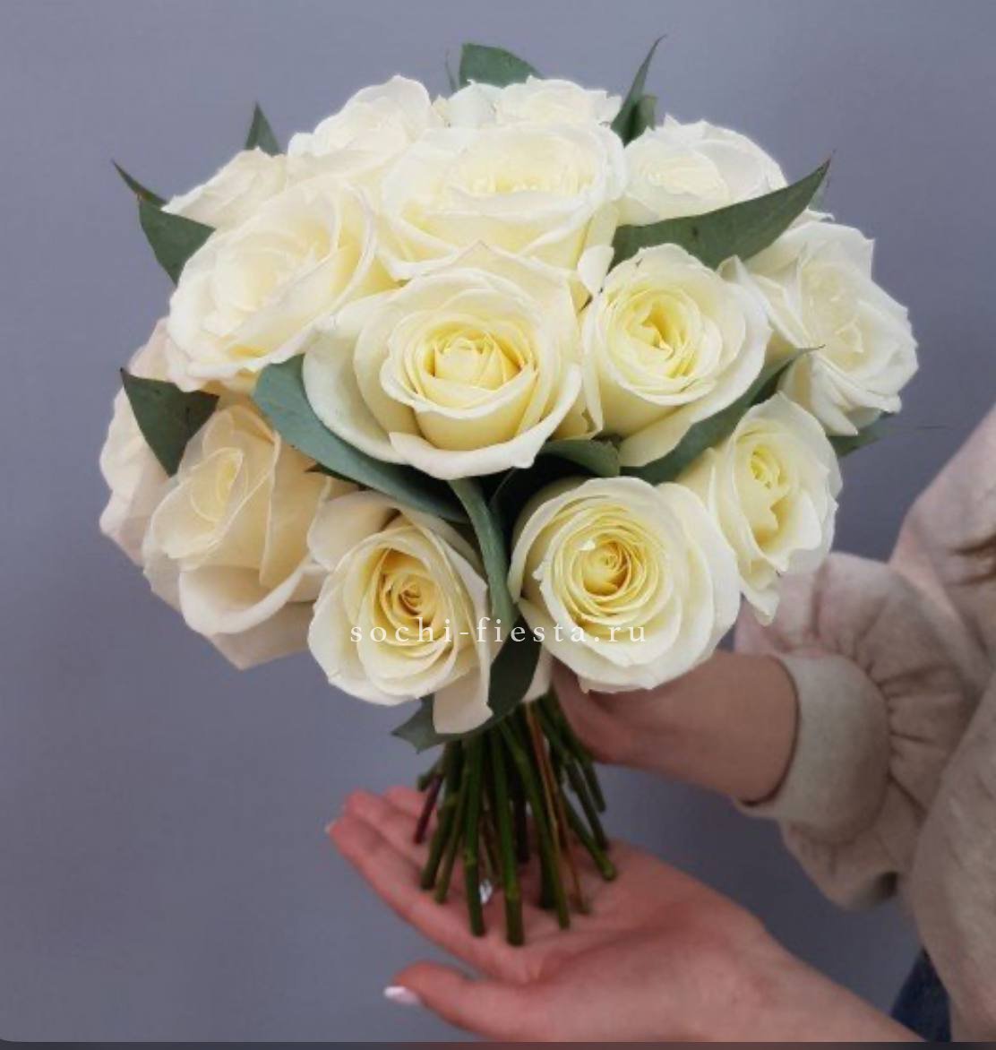 Девятнадцать бутонов эустомы раскрываются слоями воздушных лепестков создавая мягкую текстурную глубину. Эвкалипт добавляет свежести этому монохромному свадебному решению.