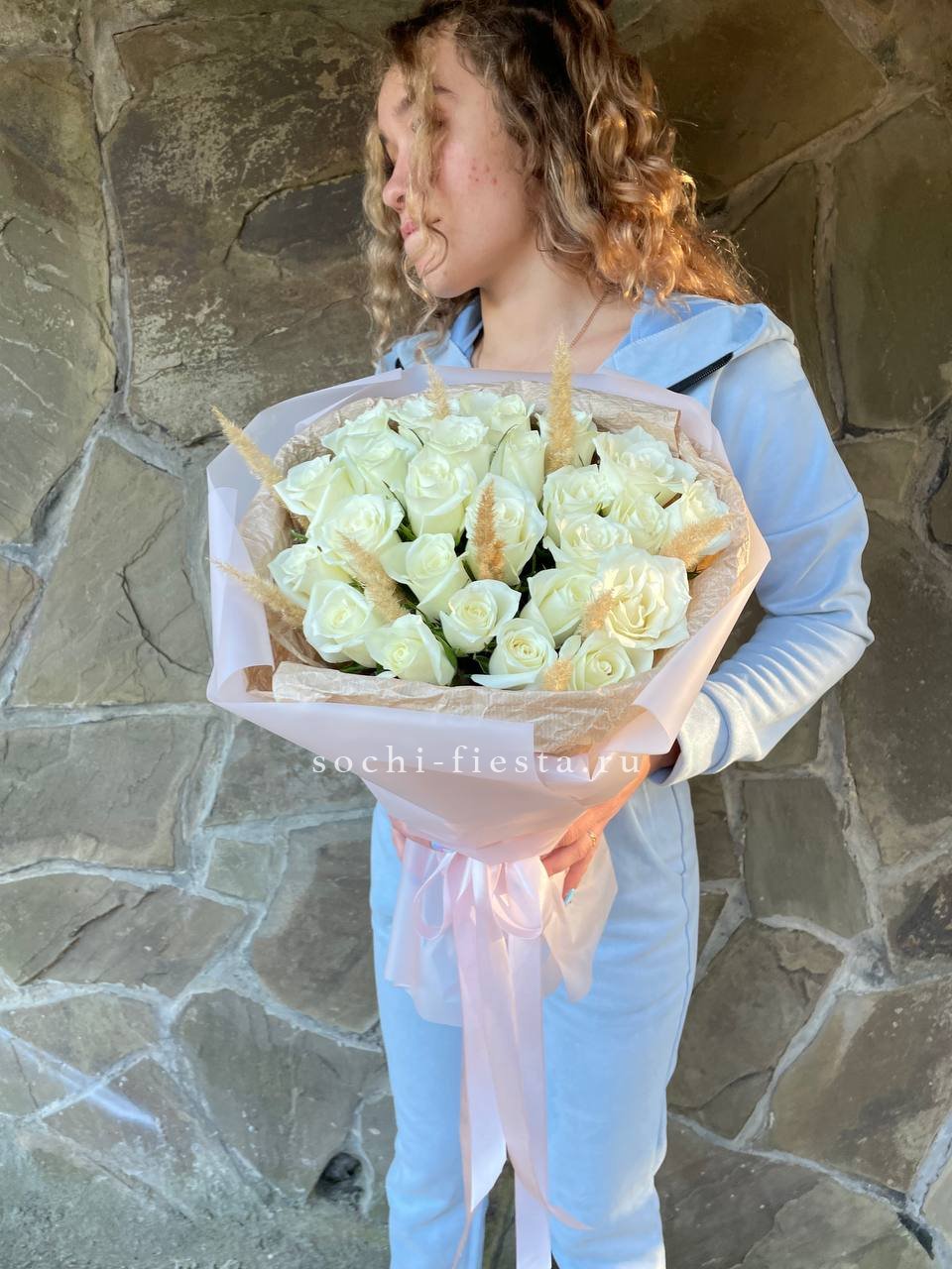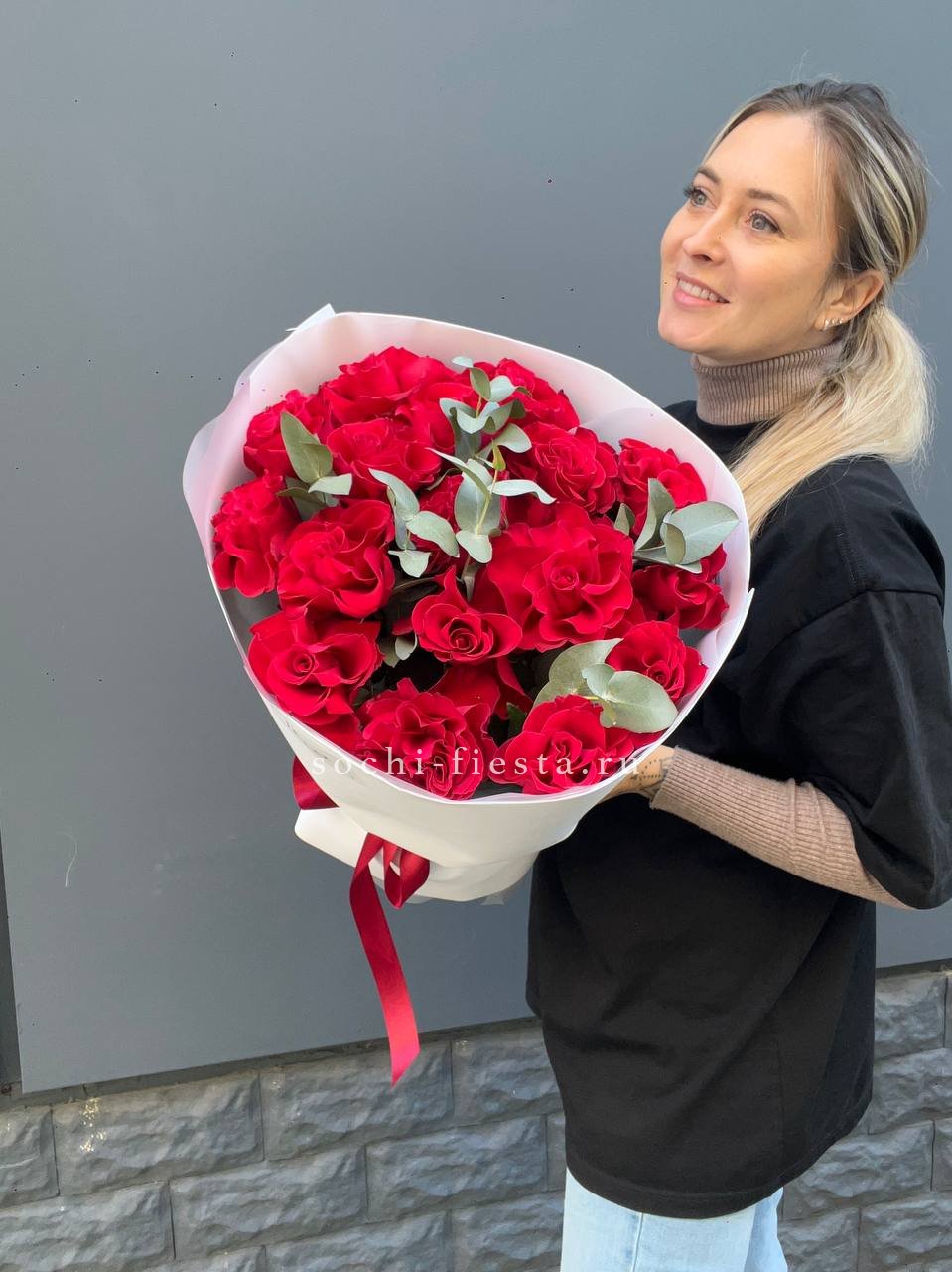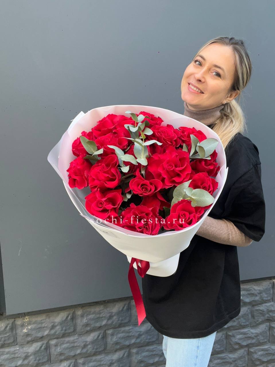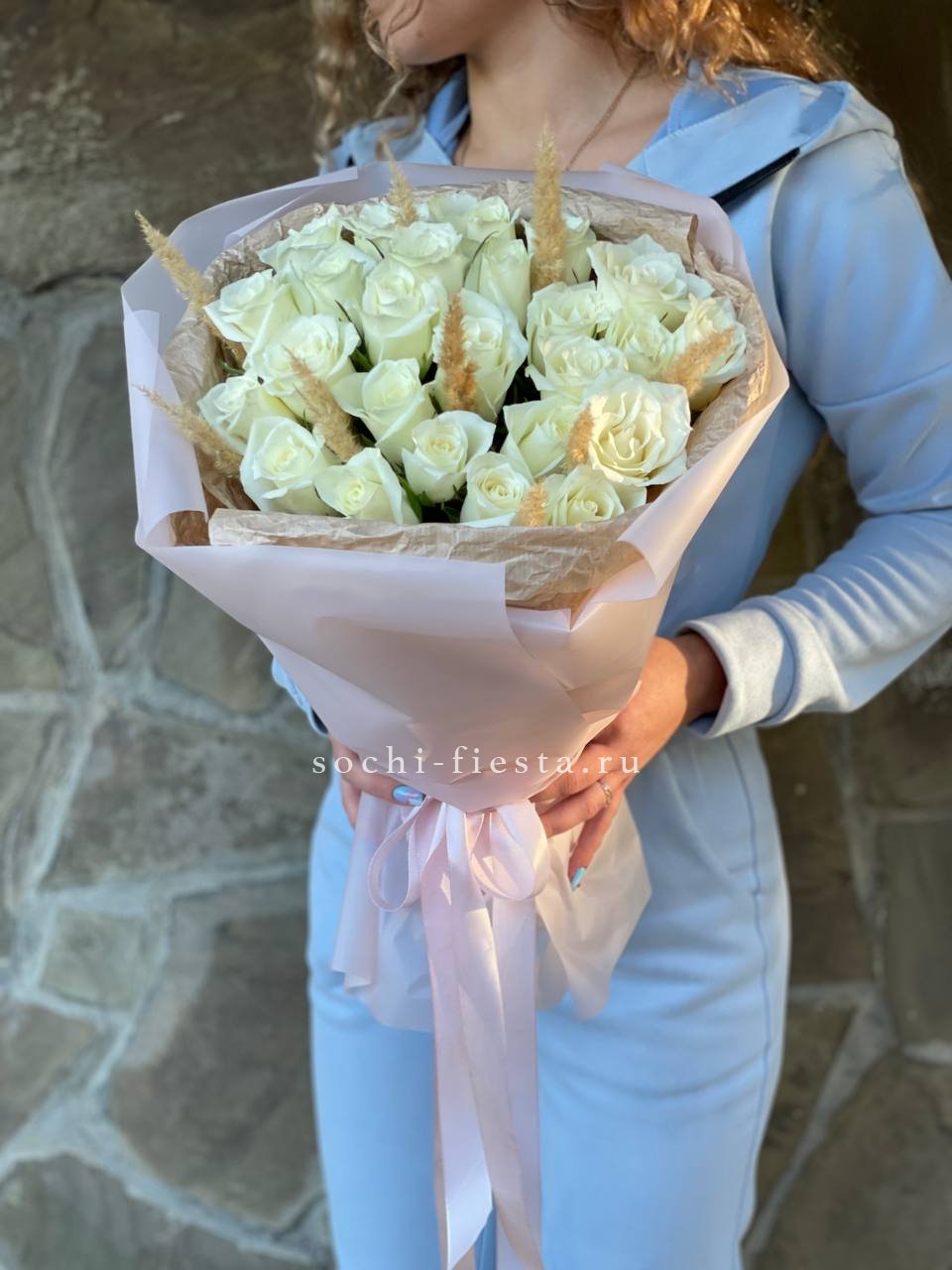 Состав букета на фотографии: 29 роз карина, крафт, лента