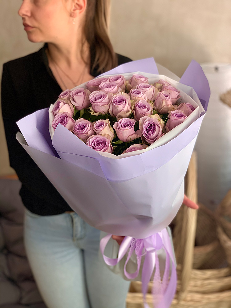 Состав букета на фотографии: розы Lullaby - 25 шт., лента, дизайнерская упаковка