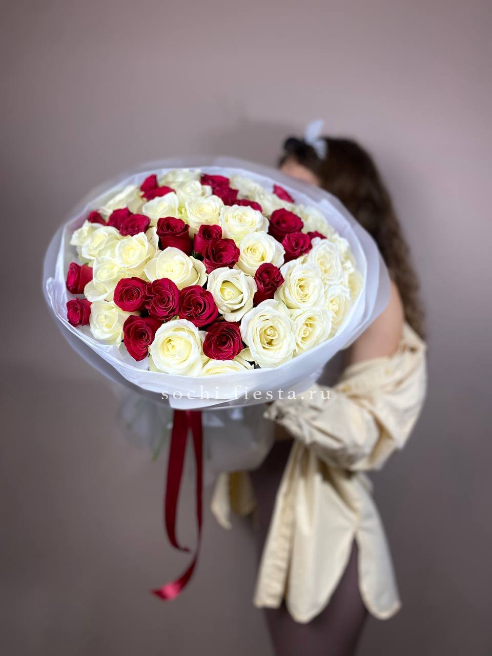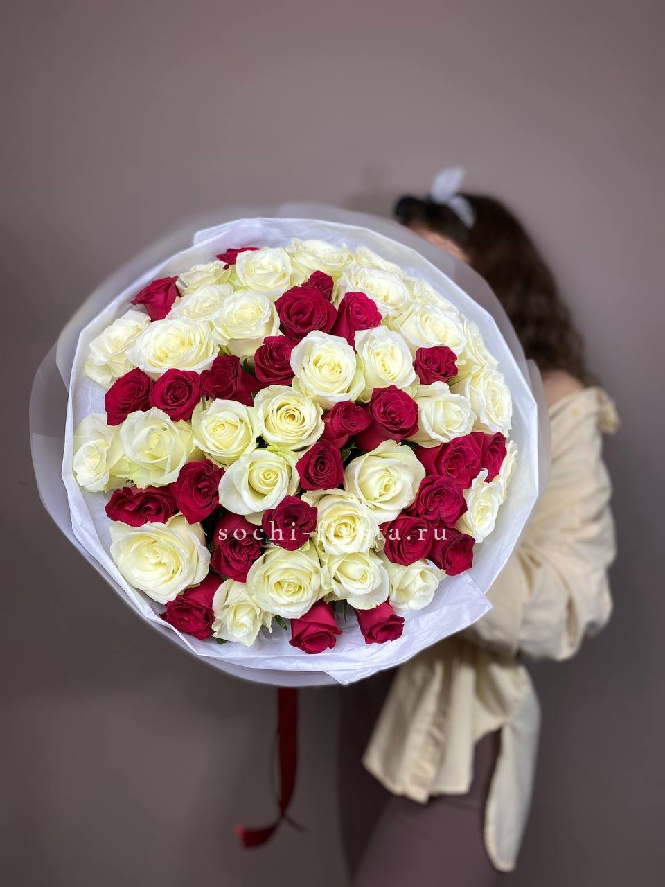 Красный и белый чередуются в свободном ритме, образуя живую композицию. Пятьдесят пять бутонов создают объёмное цветовое полотно, где каждый оттенок усиливает звучание другого.