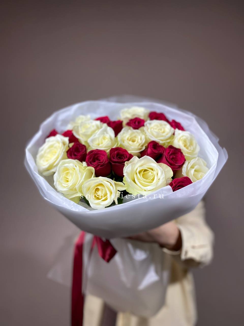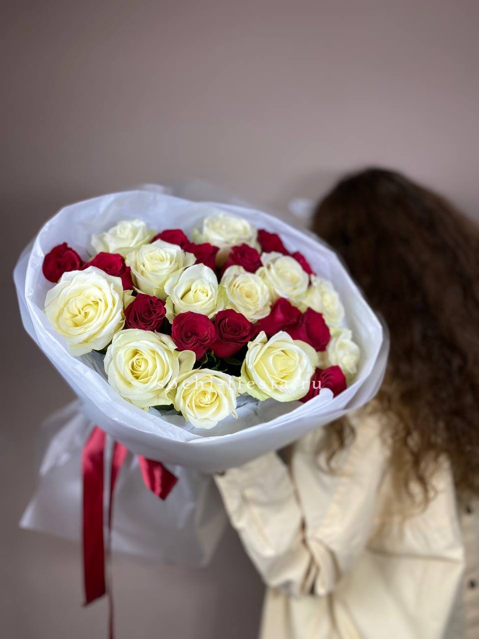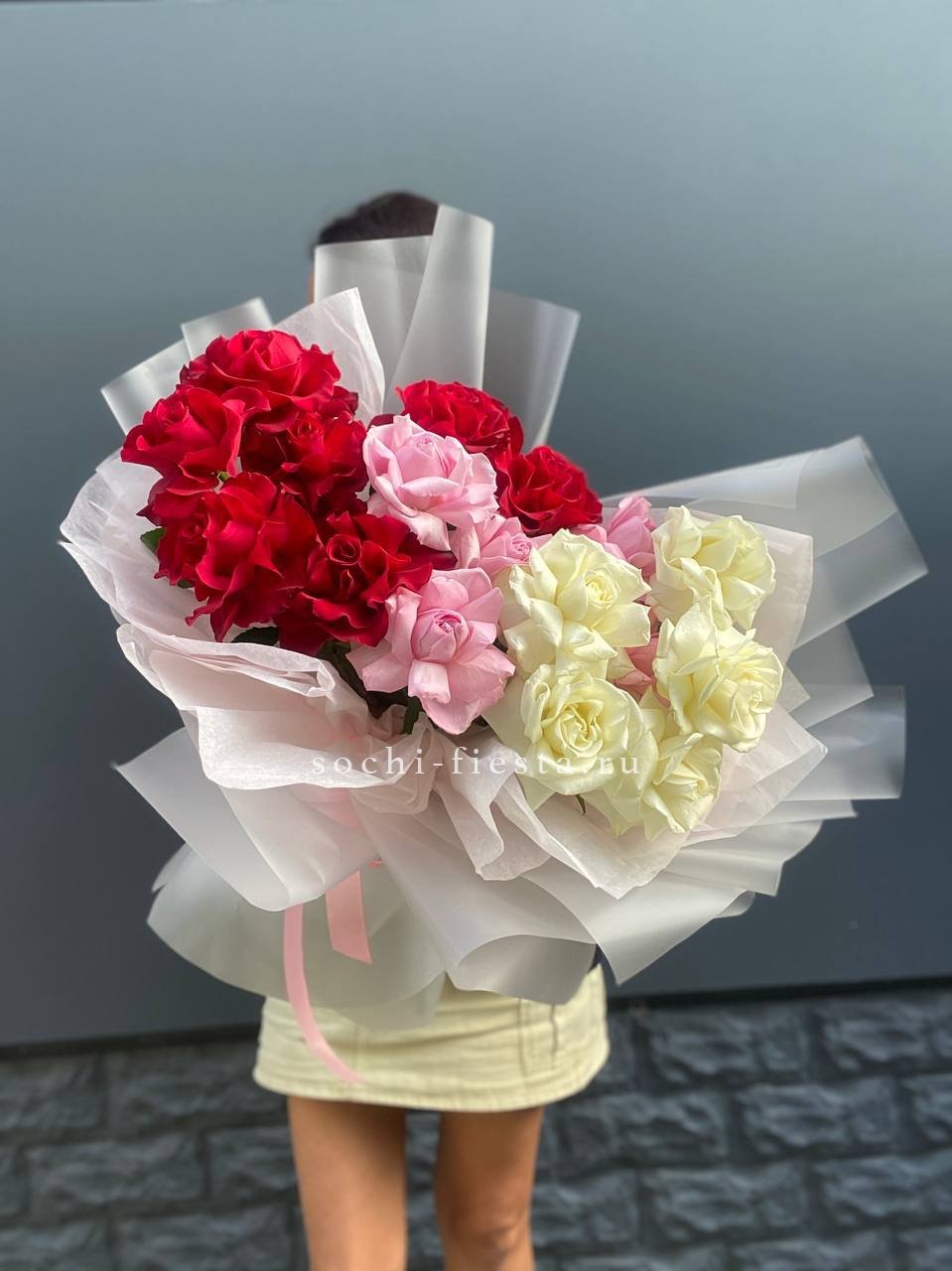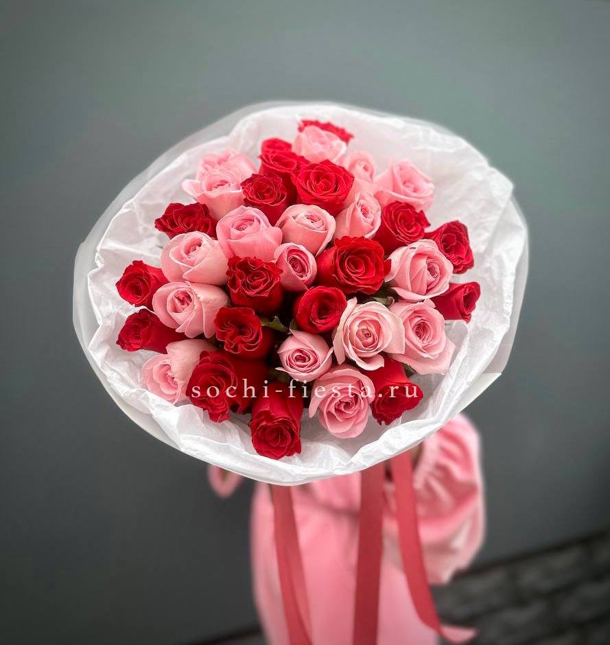 55 роз белого и розового оттенков или же с добавлением кремовой розы, лента, упаковка.