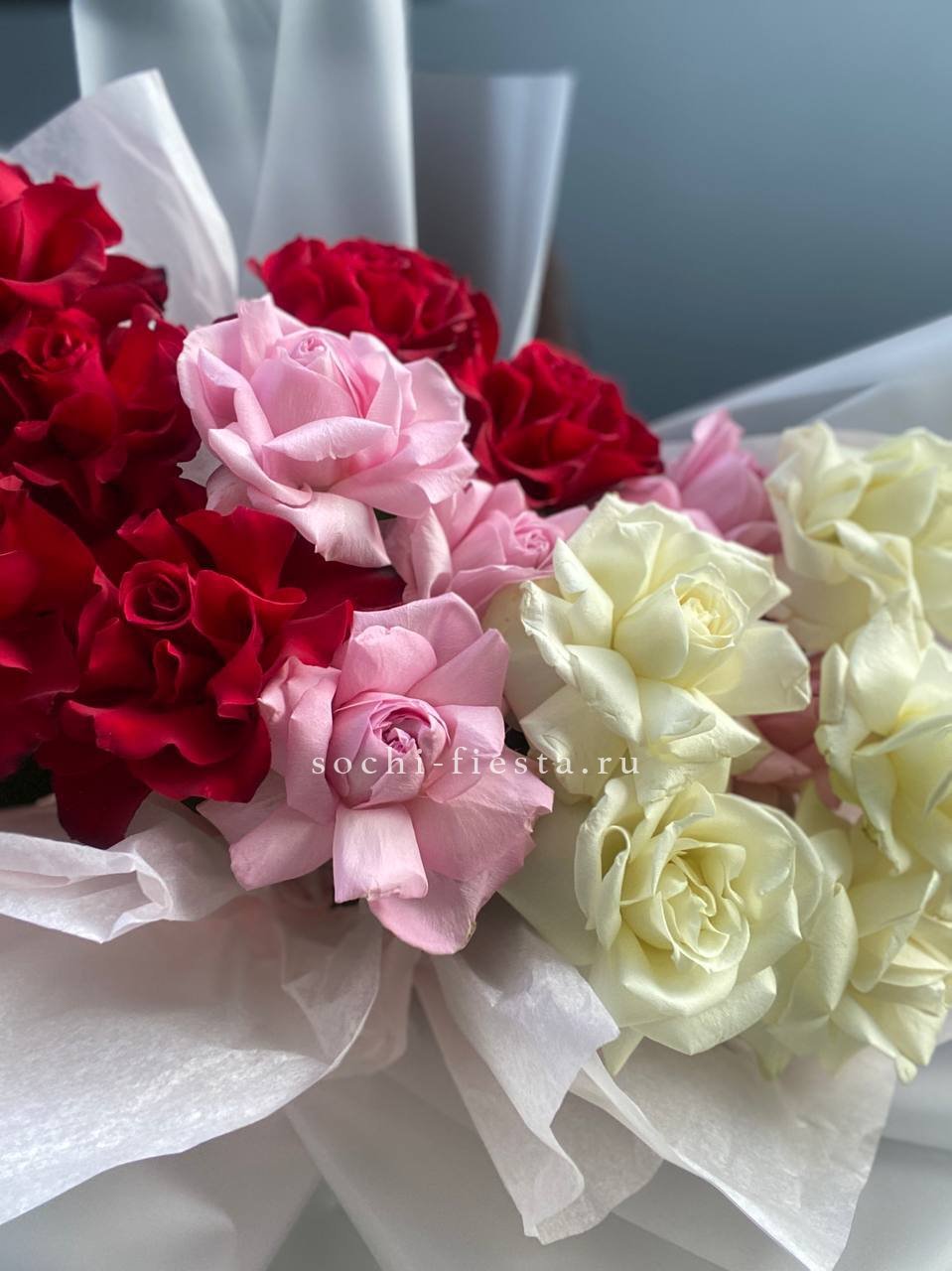 Пятьдесят пять роз переплетают белый и розовый в мягкую градацию без четких границ. Букет дышит светом и воздухом, а его объем позволяет рассмотреть каждый бутон отдельно.