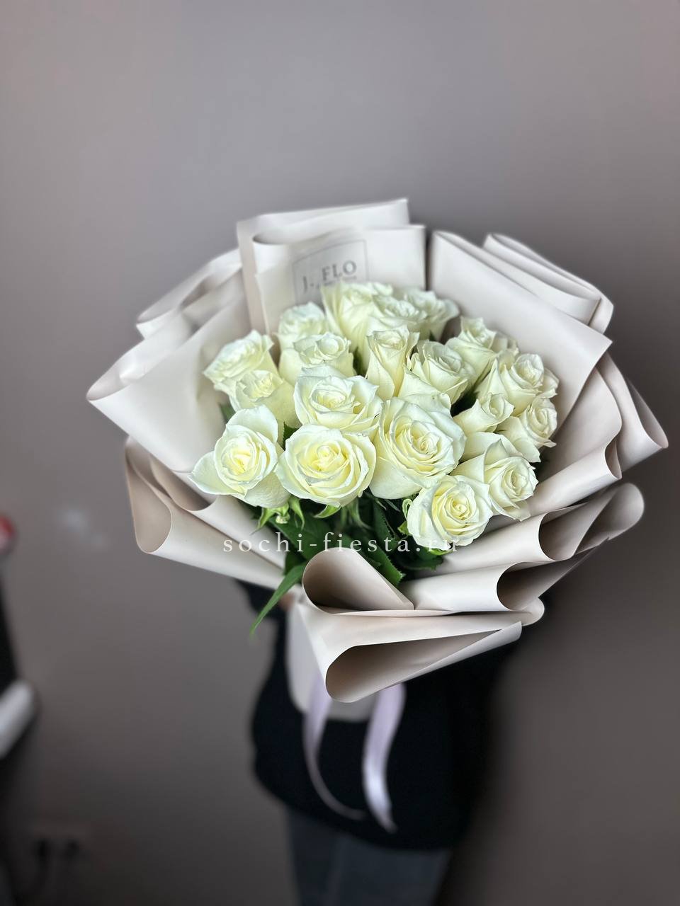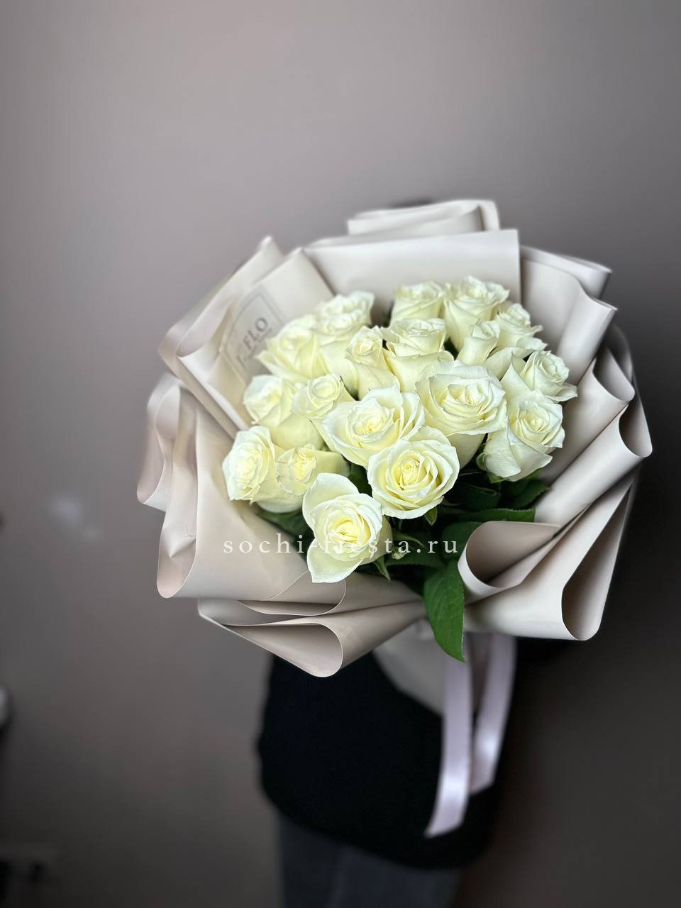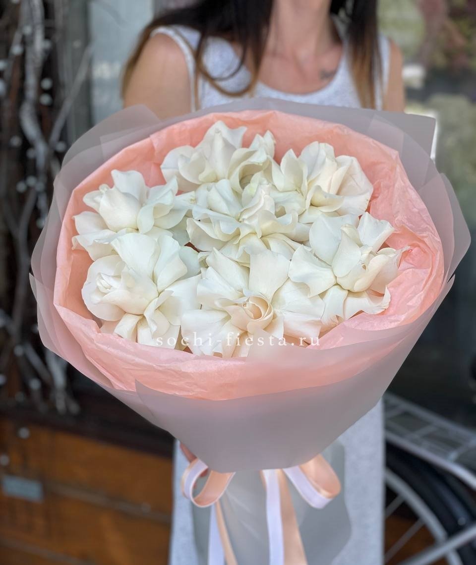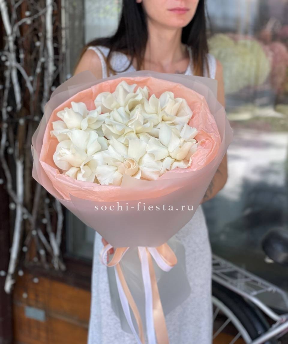 Пятнадцать белых роз собраны в плотный букет с чистыми линиями. Прозрачная упаковка сохраняет свежесть и открывает естественную красоту бутонов.