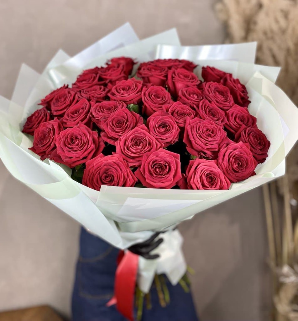 37 красных роз, лента, дизайнерская пленка.