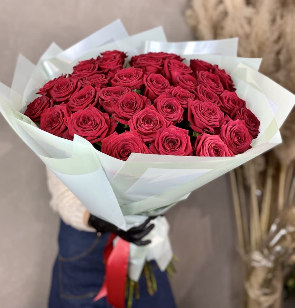 Классическая красная гамма в масштабной подаче. Тридцать семь стеблей формируют округлую композицию с четким силуэтом. Букет занимает пространство и сразу привлекает внимание.
