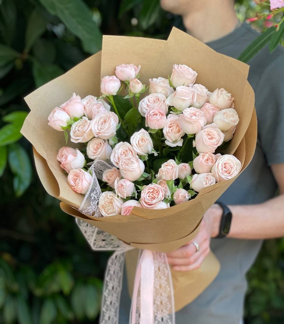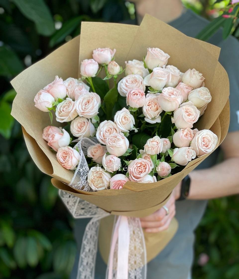 Минимальный состав: 35 пионовидных кустовых роз Мисти бабблс, лента, авторское оформление.