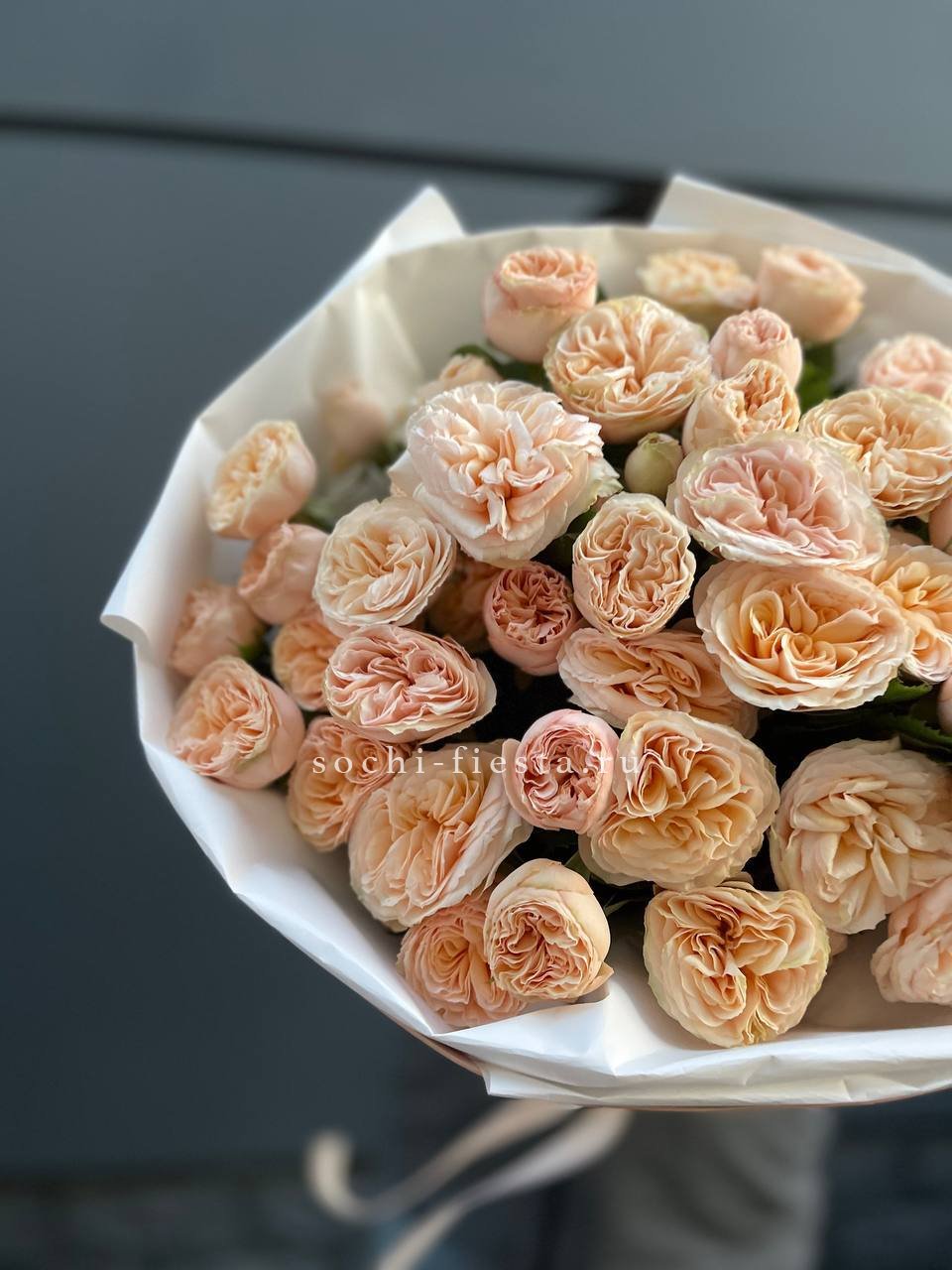 кустовая пионовидная роза, лента, дизайнерская упаковка.