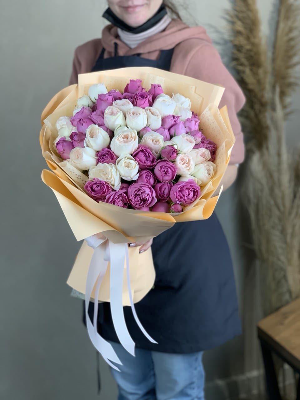 минимальный состав: 9 лавандовых пионовидных кустовых роз, лента, упаковка на выбор.