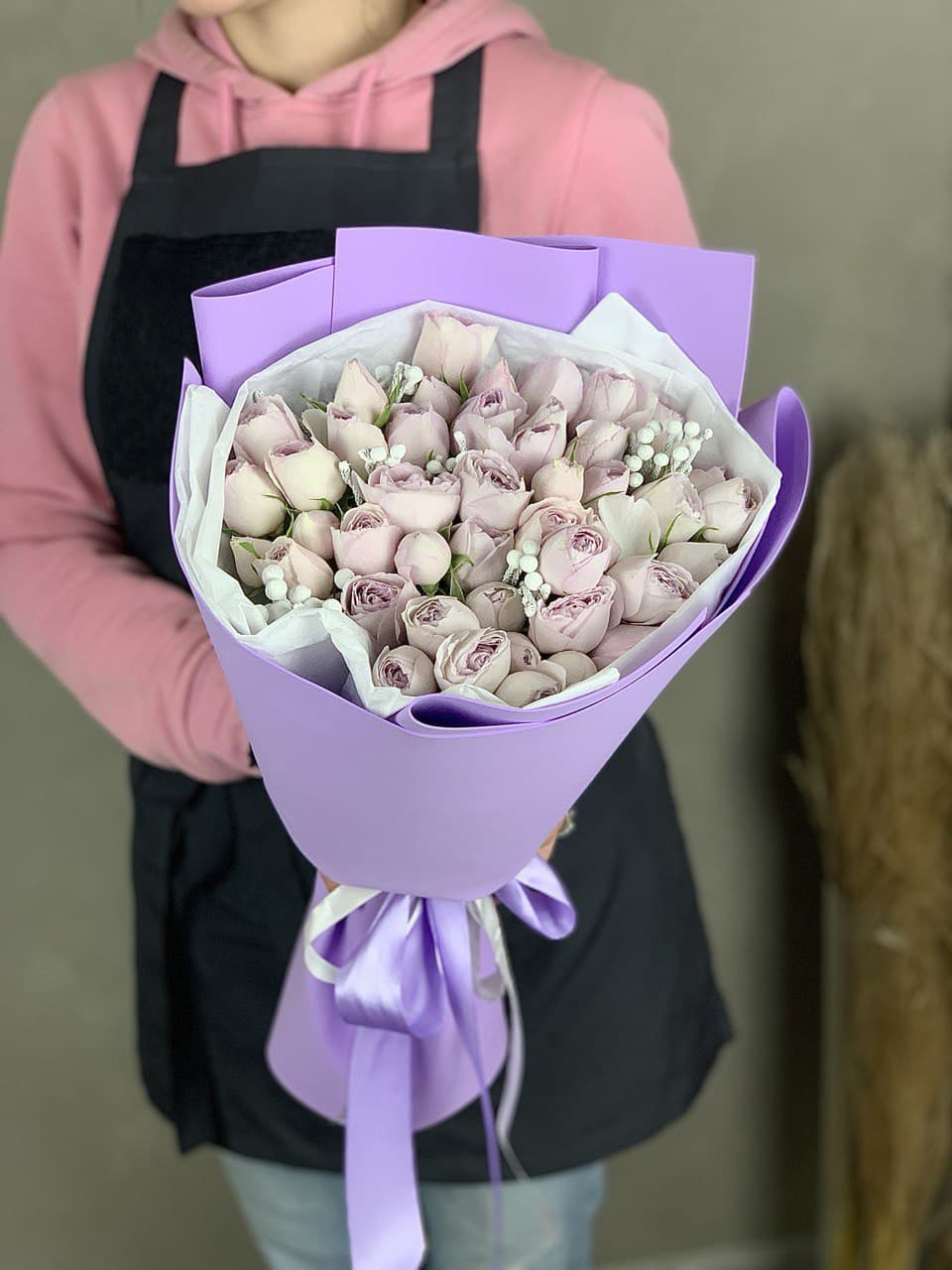 13 пионовидных кустовых роз Lavender, 4 брунии сильвер уайт, лента, тишью, фоамиран.