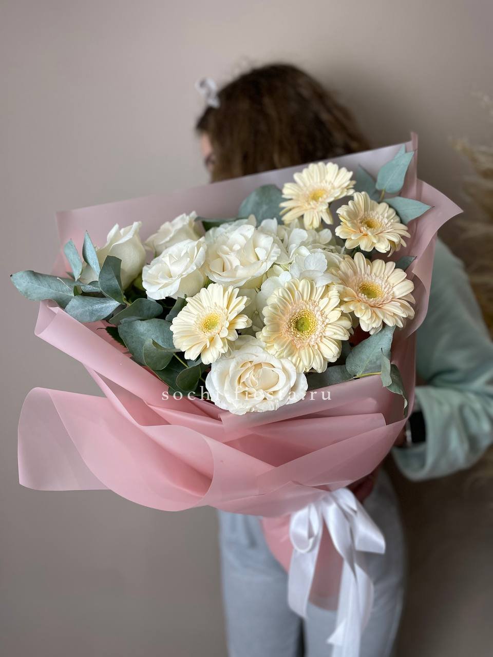 диантус, эустома, эвкалипт,  лента, дизайнерская пленка.