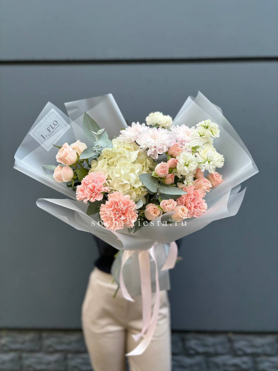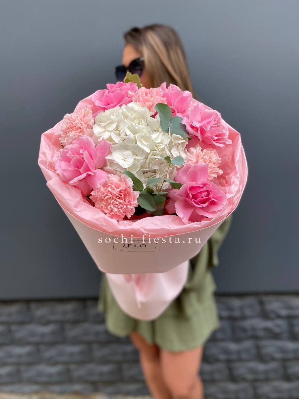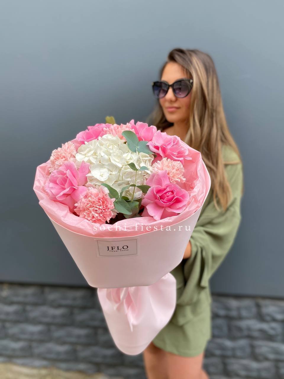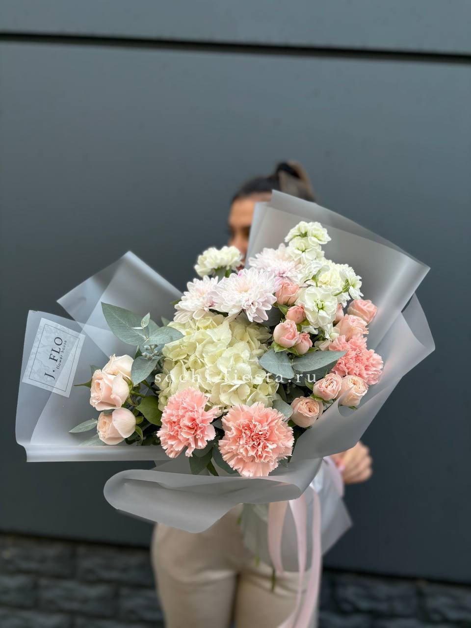 Диантусы создают воздушную текстуру между крупными бутонами роз в розовой и белой гамме. Эвкалипт добавляет графичности и свежести всей композиции.