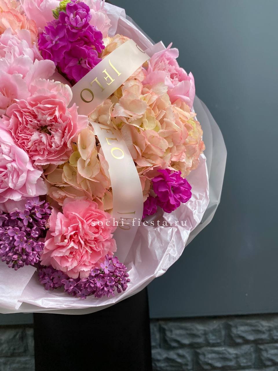 пионы, гортензии, диантусы, маттиола лента и дизайнерская пленка.