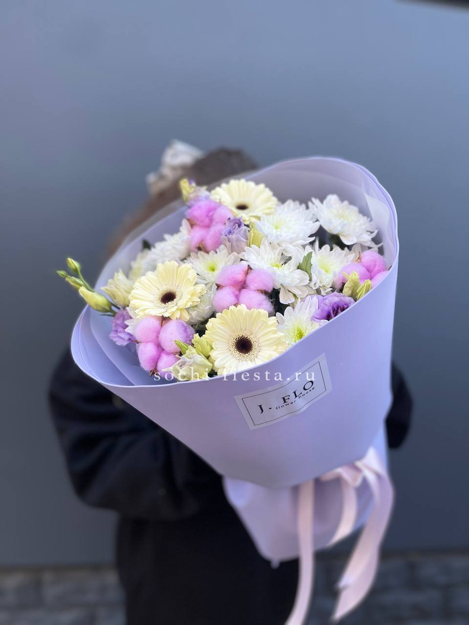 герберы, хлопок, эустома, хризантемы,  авторское оформление.