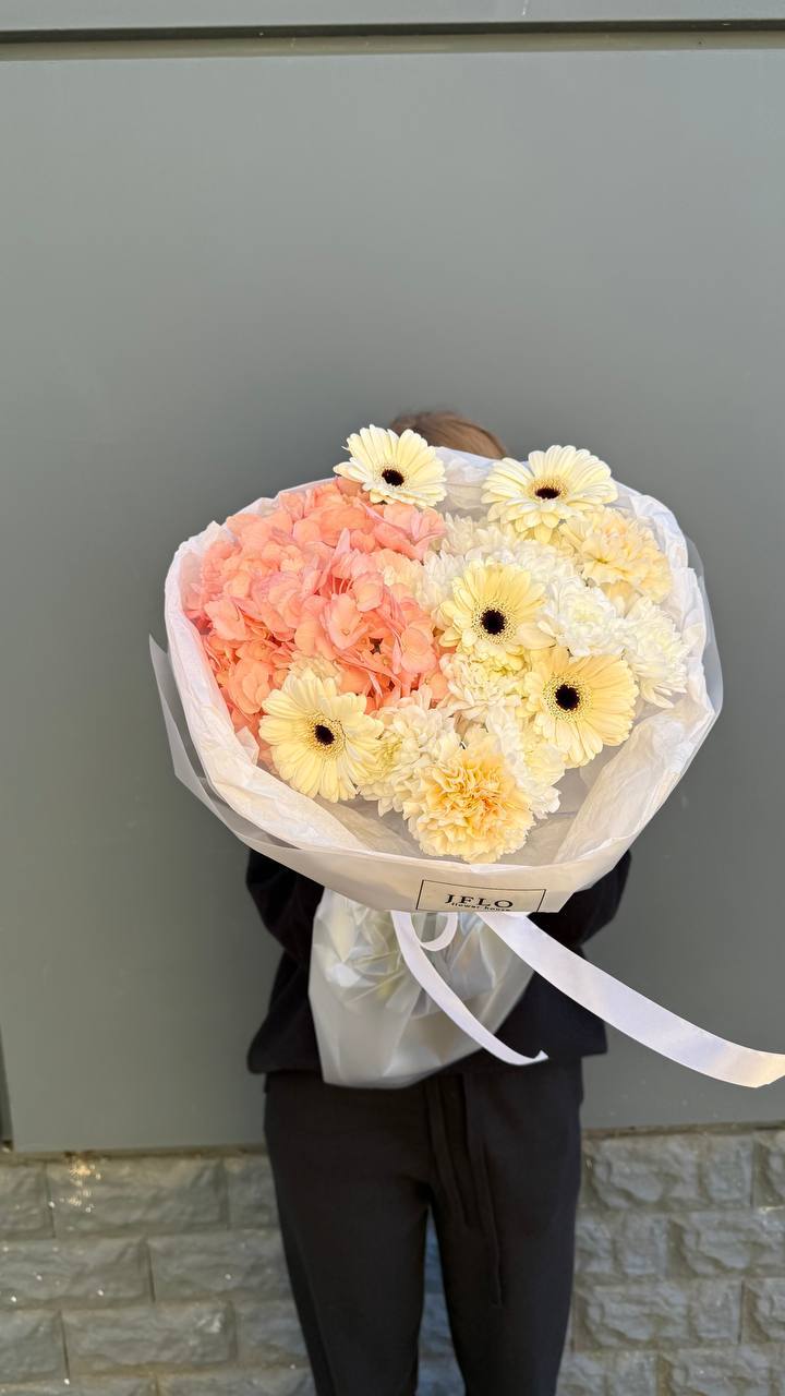 Гортензия, хризантема, роза и эустома раскрываются по-разному: одни бутоны плотные и графичные, другие воздушные и многослойные. Фактурная игра лепестков создает визуальную глубину.
