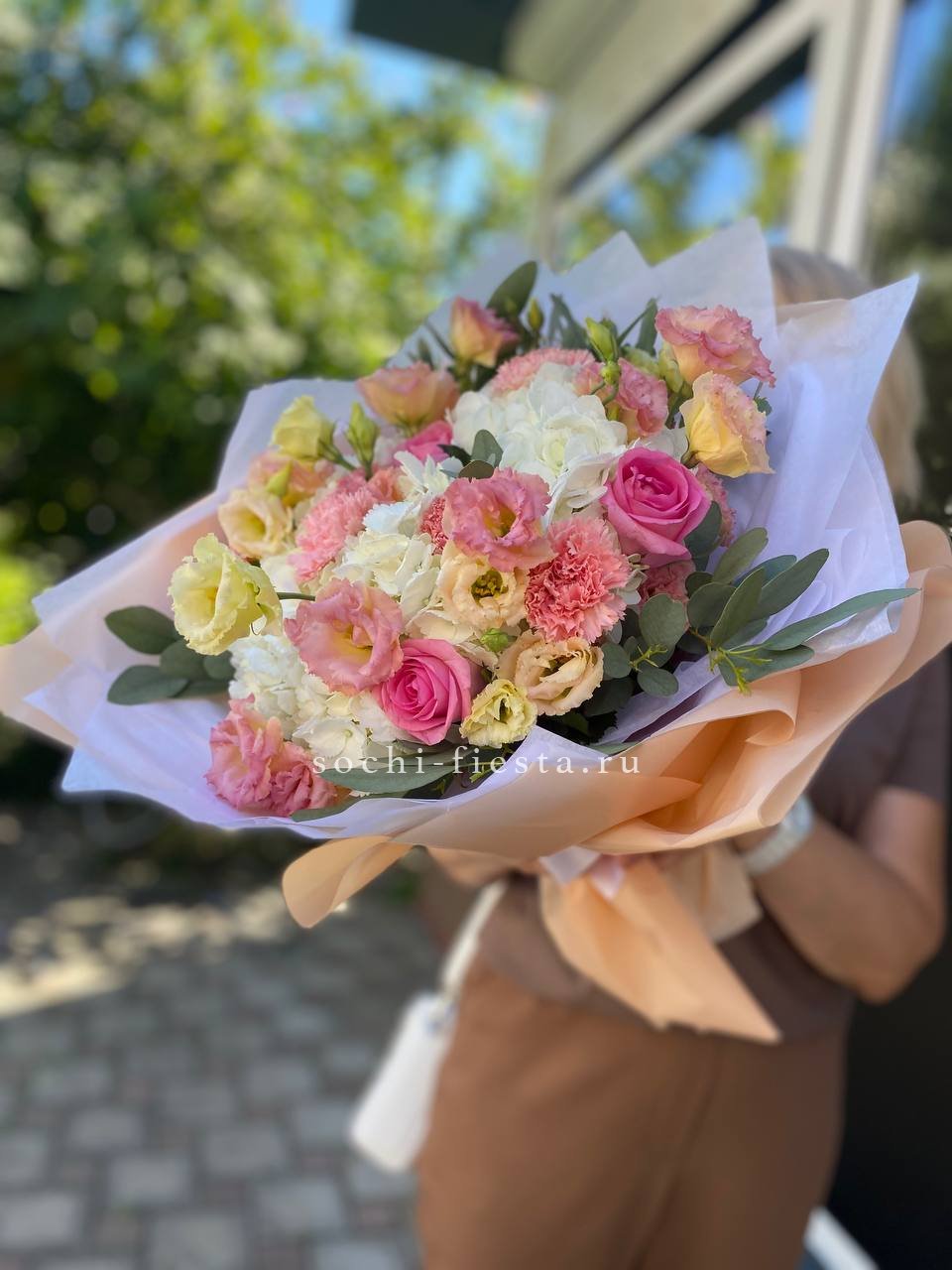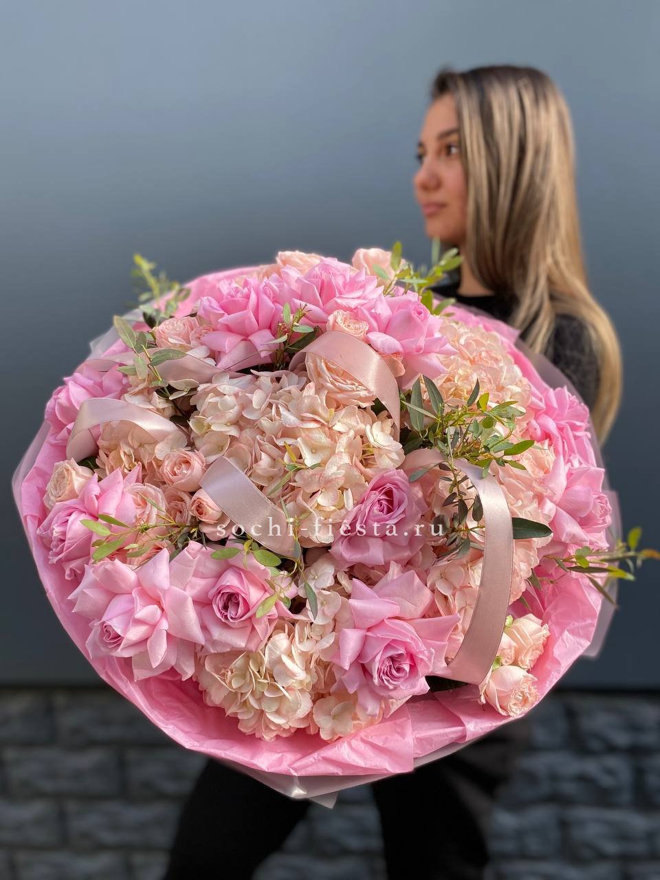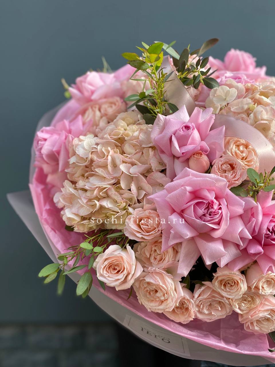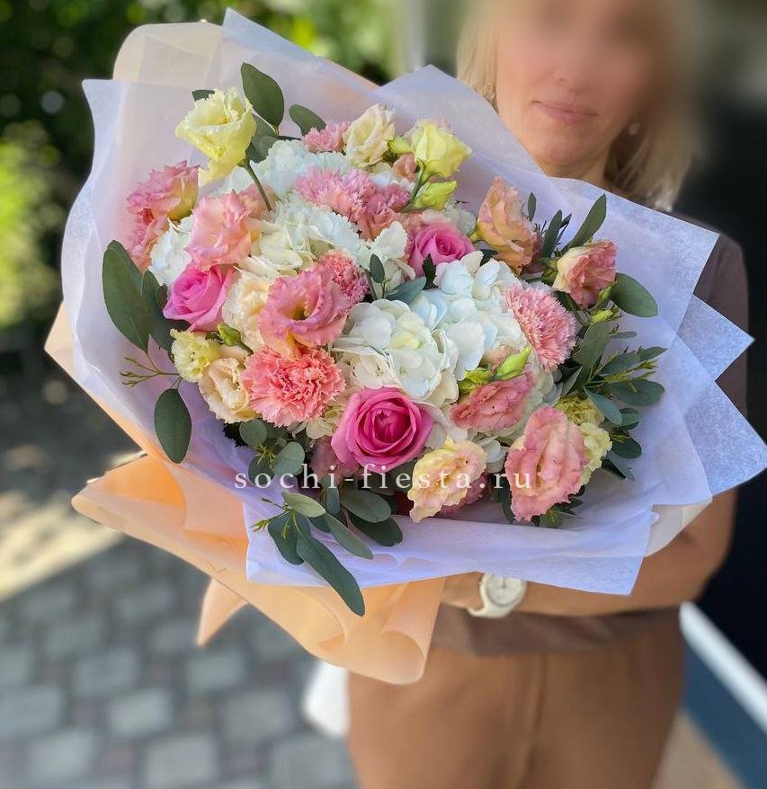 Воздушная композиция с крупными соцветиями гортензии и пышными розами создает ощущение легкости и объема. Эвкалипт добавляет свежести, а бомбастик расставляет яркие акценты между бутонами.
