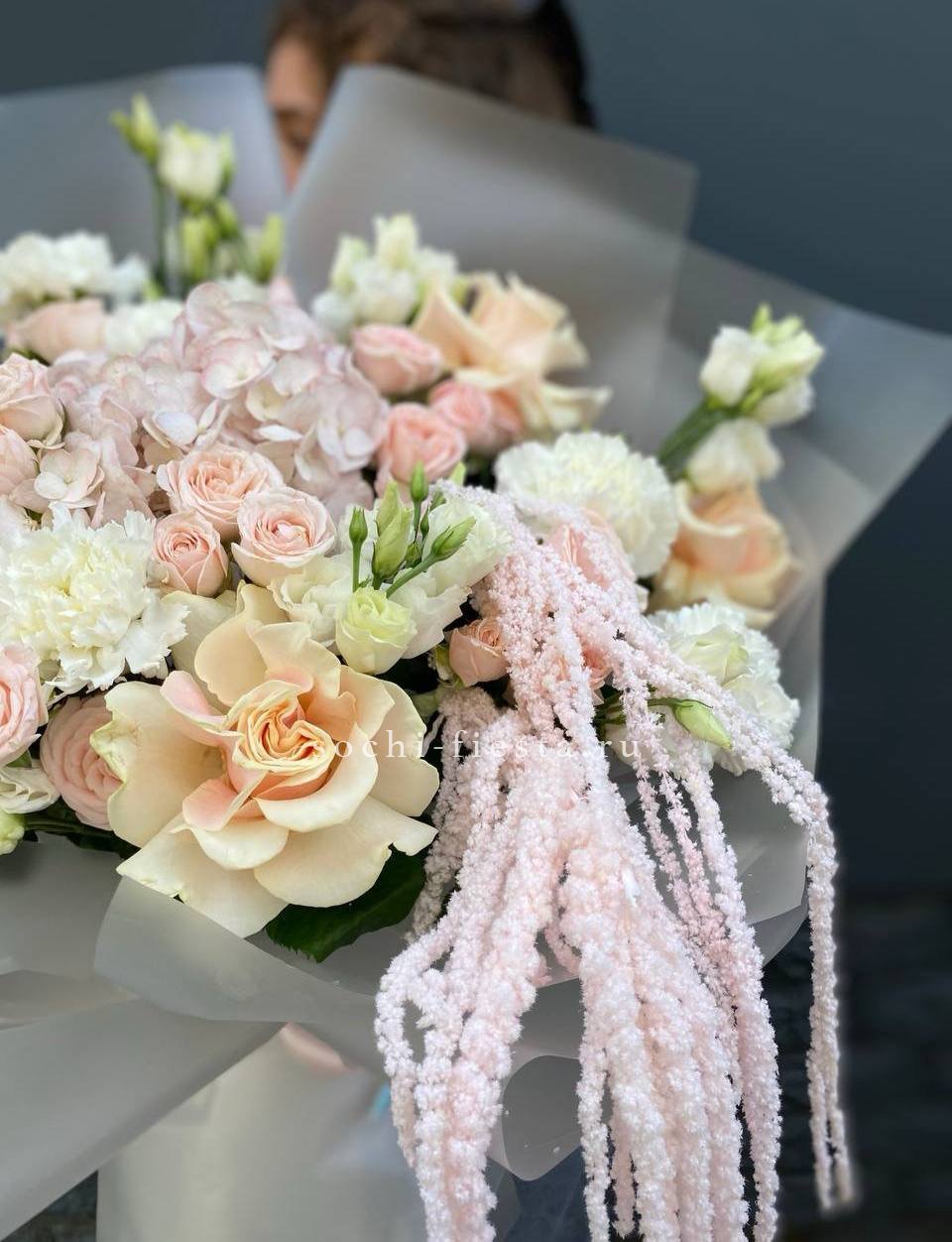 кустовые розы, гортензии, французские розы, диантусы, эустомы, лента и дизайнерская пленка.