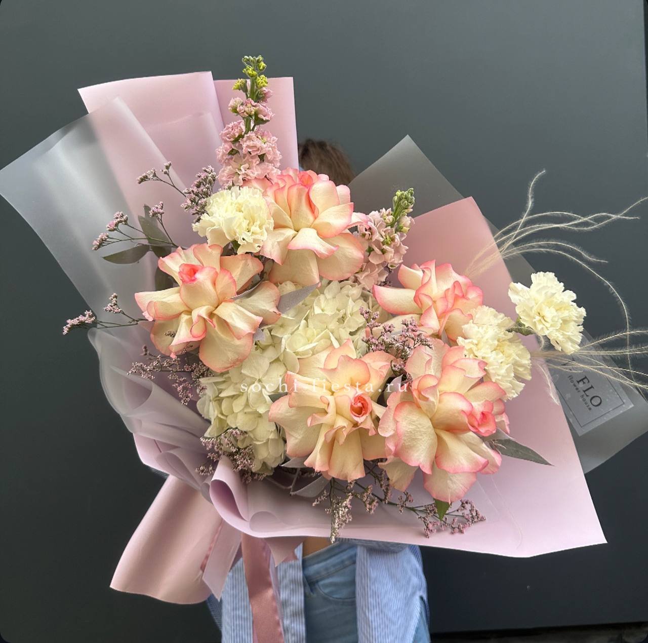 гортензия, французские розы, маттиола, лимониум, дианстусы, эвкалипт, ковыль и дизайнерская упаковка.