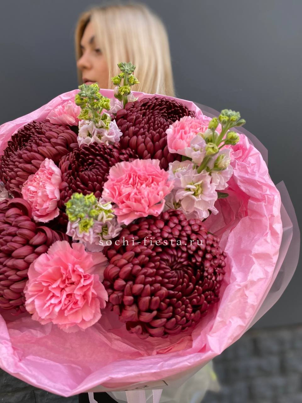 Воздушная композиция с пышными головками маттиолы и яркими диантусами создаёт лёгкое весеннее настроение. Каждый бутон раскрывается по-своему, добавляя объём и живую динамику всему букету.