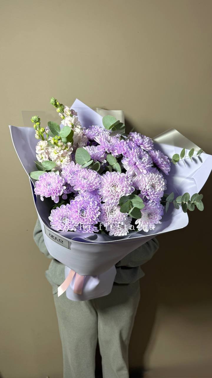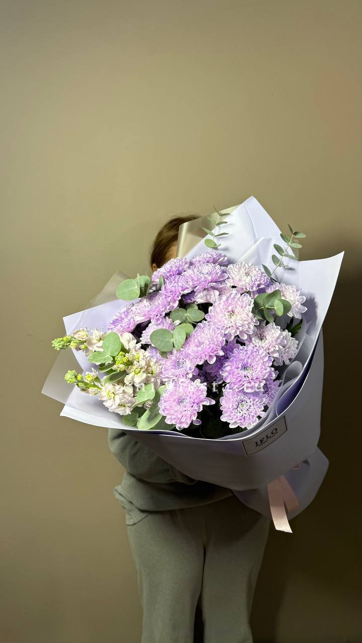 кустовые розы, хризантемы, диантусы, лагурус, лента и дизайнерская пленка.