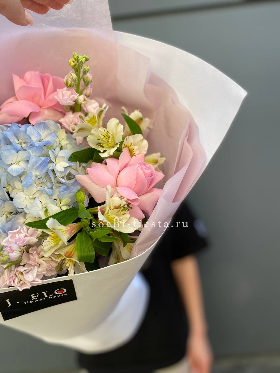 розы, гортензия, альстромерии, маттиола лента и дизайнерская пленка.