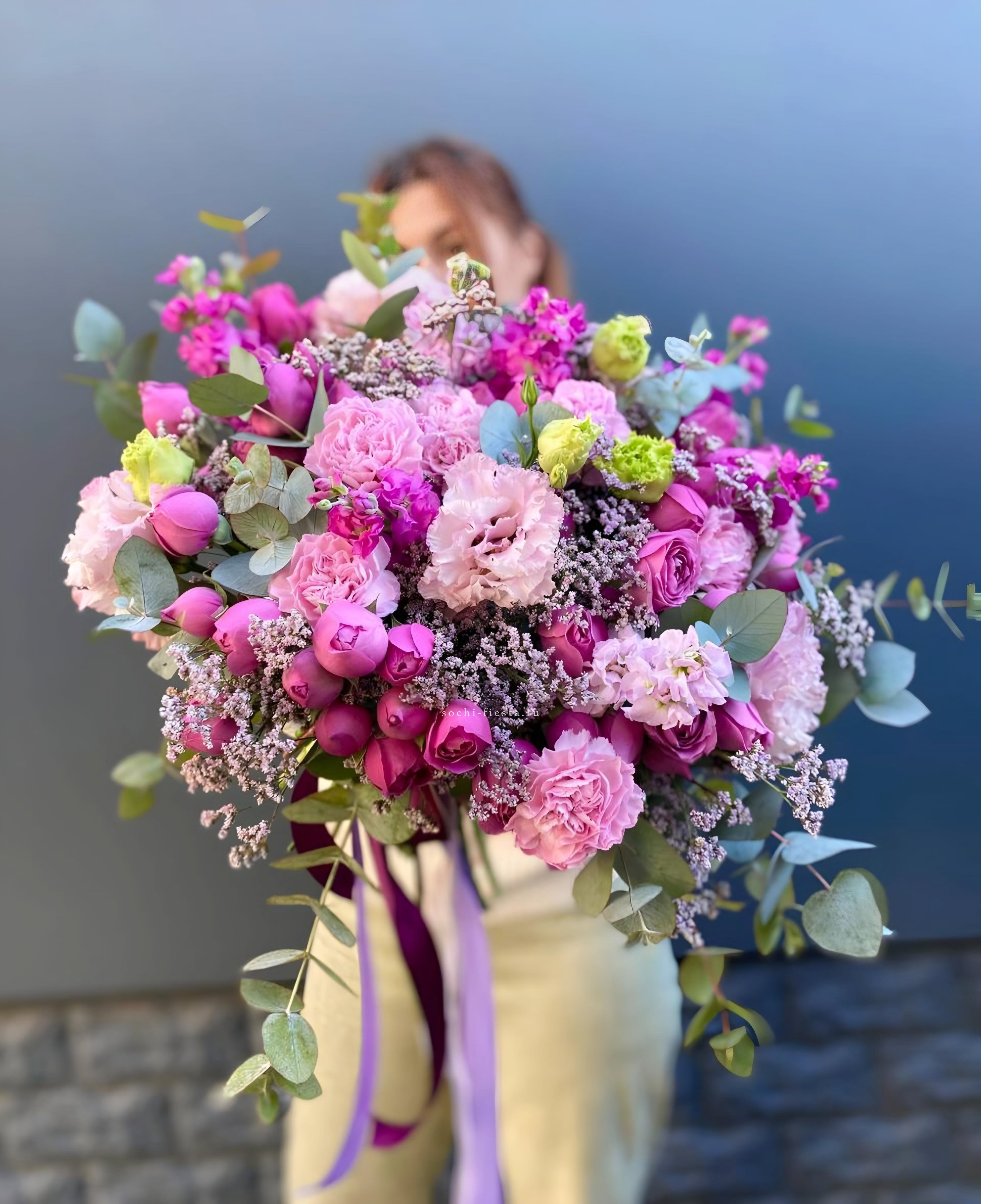 Маттиола и эустома создают воздушную текстуру, а пионовидные розы Мисти Баблс добавляют глубину каждому слою. Лимониум и эвкалипт заполняют пространство между бутонами, формируя сложный рисунок. Букет звучит современно и свободно.