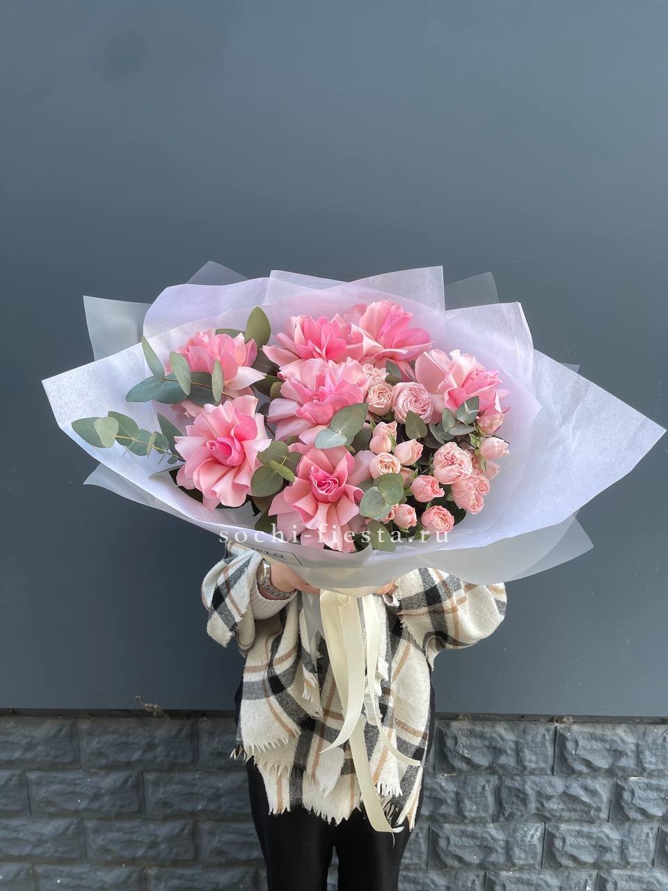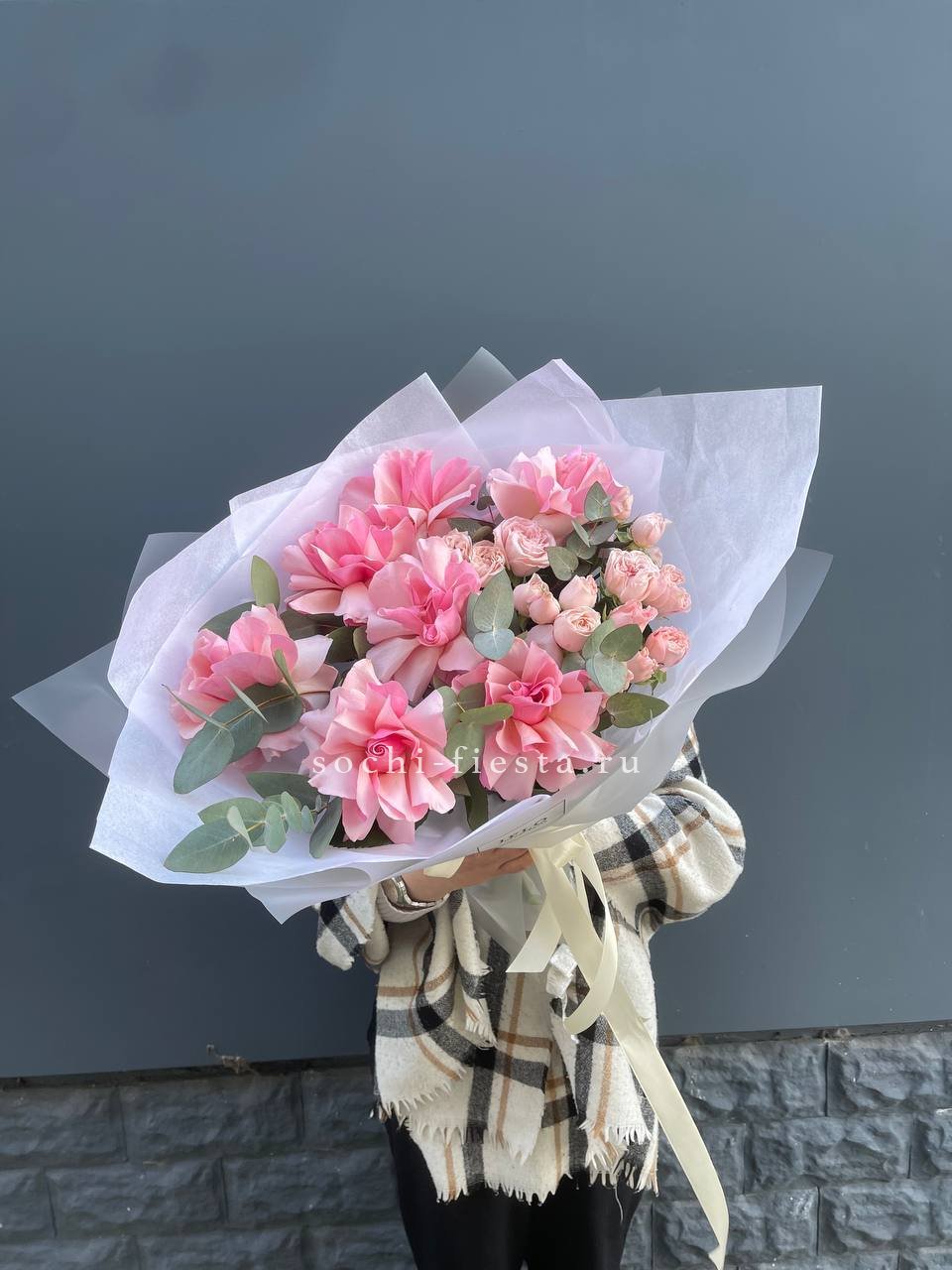 маттиола, диантусы, пионовидные розы Мисти Баблс, эвкалипт, лимониум, эустома лента, упаковка.