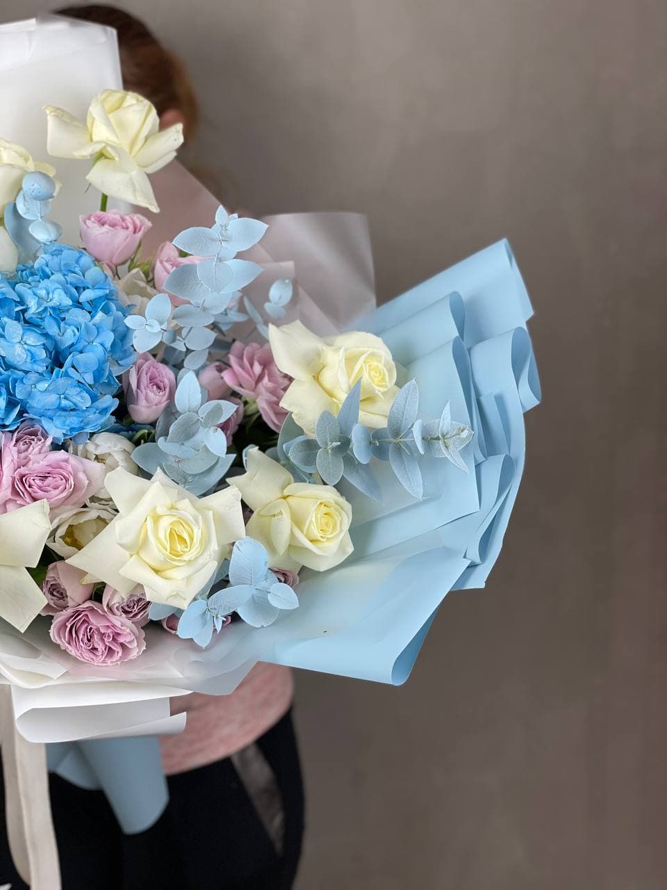 Прохладная палитра голубой гортензии и пионовидных роз в дизайнерском исполнении. Тюльпаны вносят весенний акцент, а эвкалипт завершает композицию мягкими линиями.