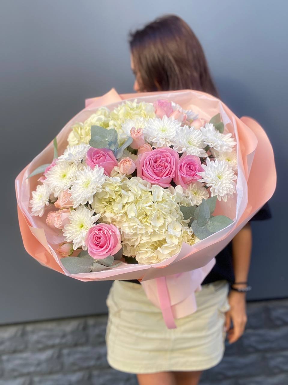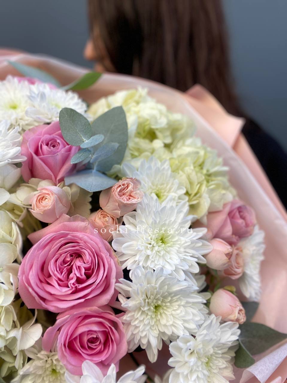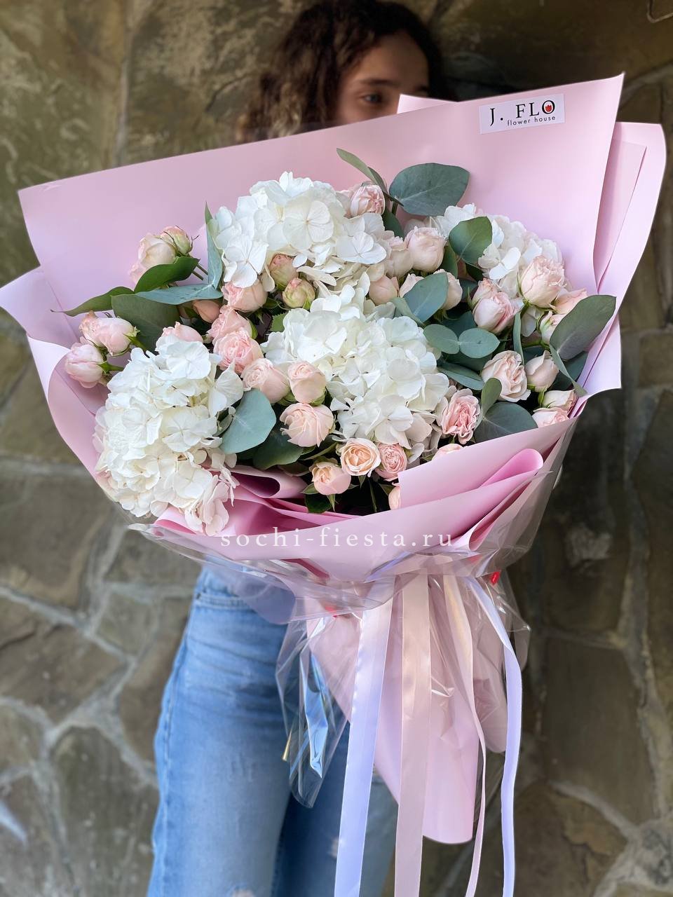 гортензия, роза одноголовая, бомбастик, декоративная зелень, эвкалипт, лента, дизайнерская упаковка.