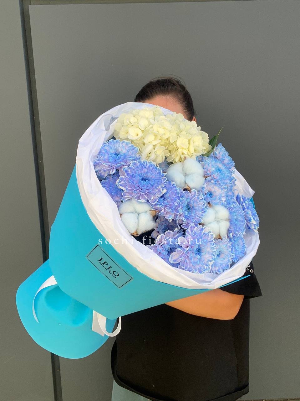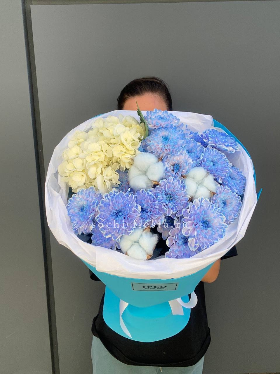 гортензия, пионовидные кустовые розы, орхидеи, нутан, протея, хамелациум, вспомогательная зелень, лента, дизайнерская упаковка.