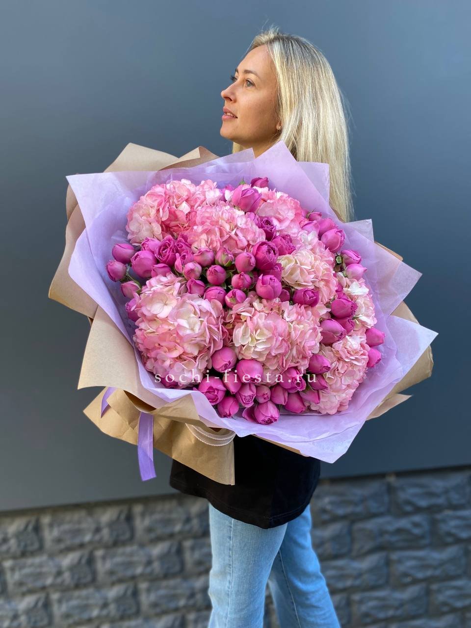 Масштабная композиция из гортензий и пионовидных кустовых роз Мисти Баблс впечатляет объёмом и присутствием. Такой букет заполняет пространство цветом и формой.